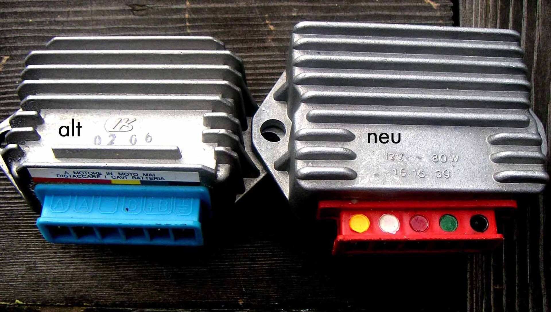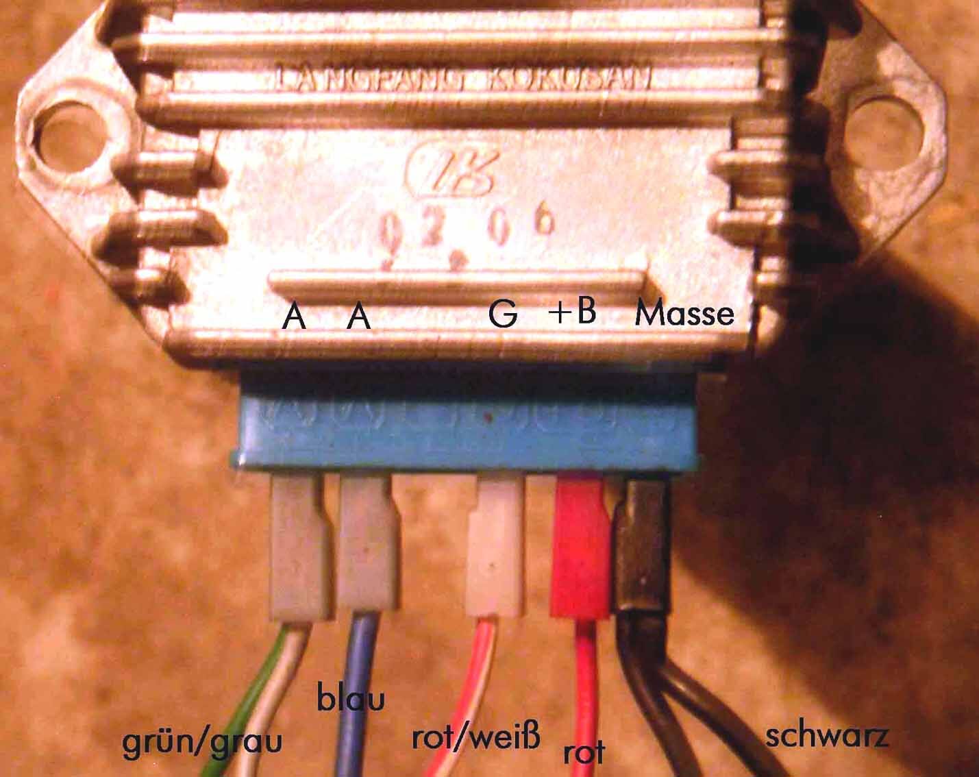 Der neue Regler hat keine Buchstaben, sondern nur Farben (in der Werkstatt sagte man mir, den würden sie in alle Vespas einbauen, GG oder AA, mache keinen Unterschied). Nun weiß ich aber nicht welche Kabel ich auf welche Kontakte stecken soll.