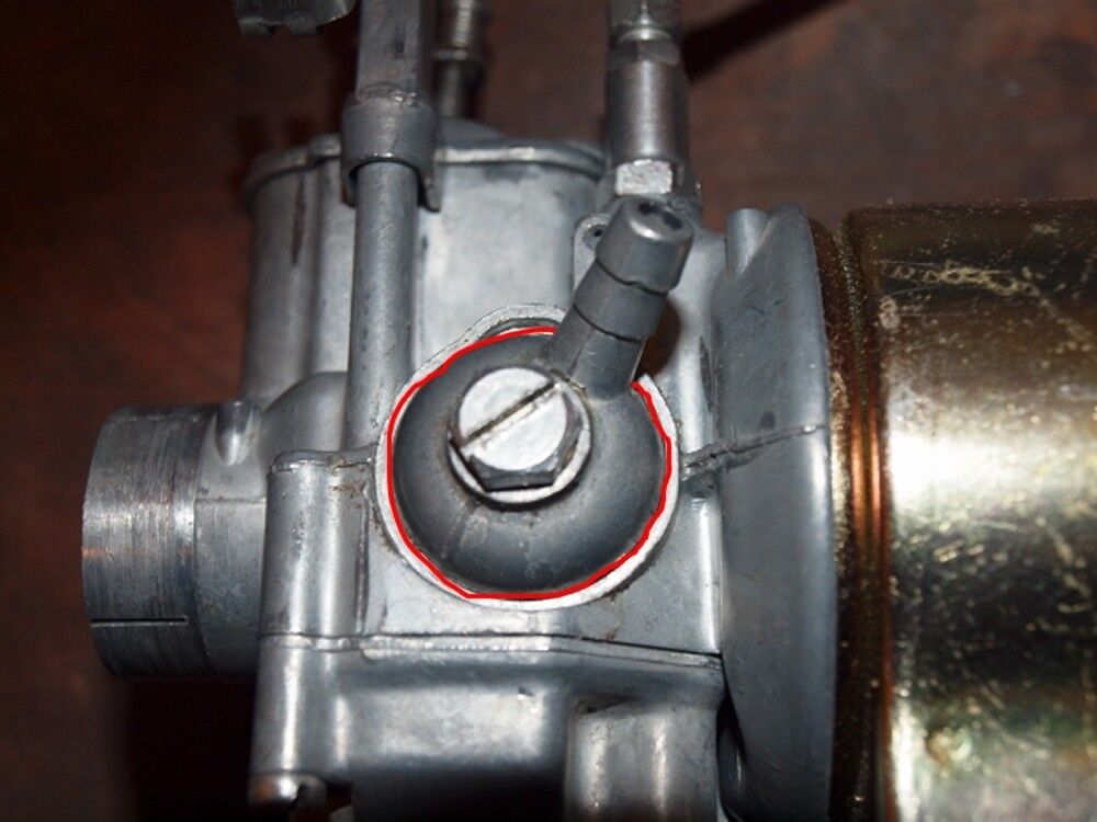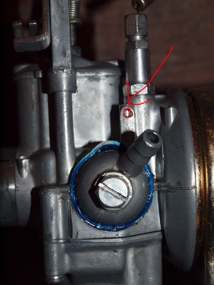 So, ich habe es mir nochmal genau angeschaut. Wie ich jetzt gemerkt habe läuft der Sprit aus dem Luftkanal vom Chokezug (->rote Markierung siehe Bild), und zwar nur bei ungezogenem Choke. Wenn man den Choke zieht läuft nichts mehr raus. Hat jemand ne Ahnung? Das kann ja nicht normal sein dass bei ungezogenem Choke der Sprit aus dieser Öffnung läuft!?