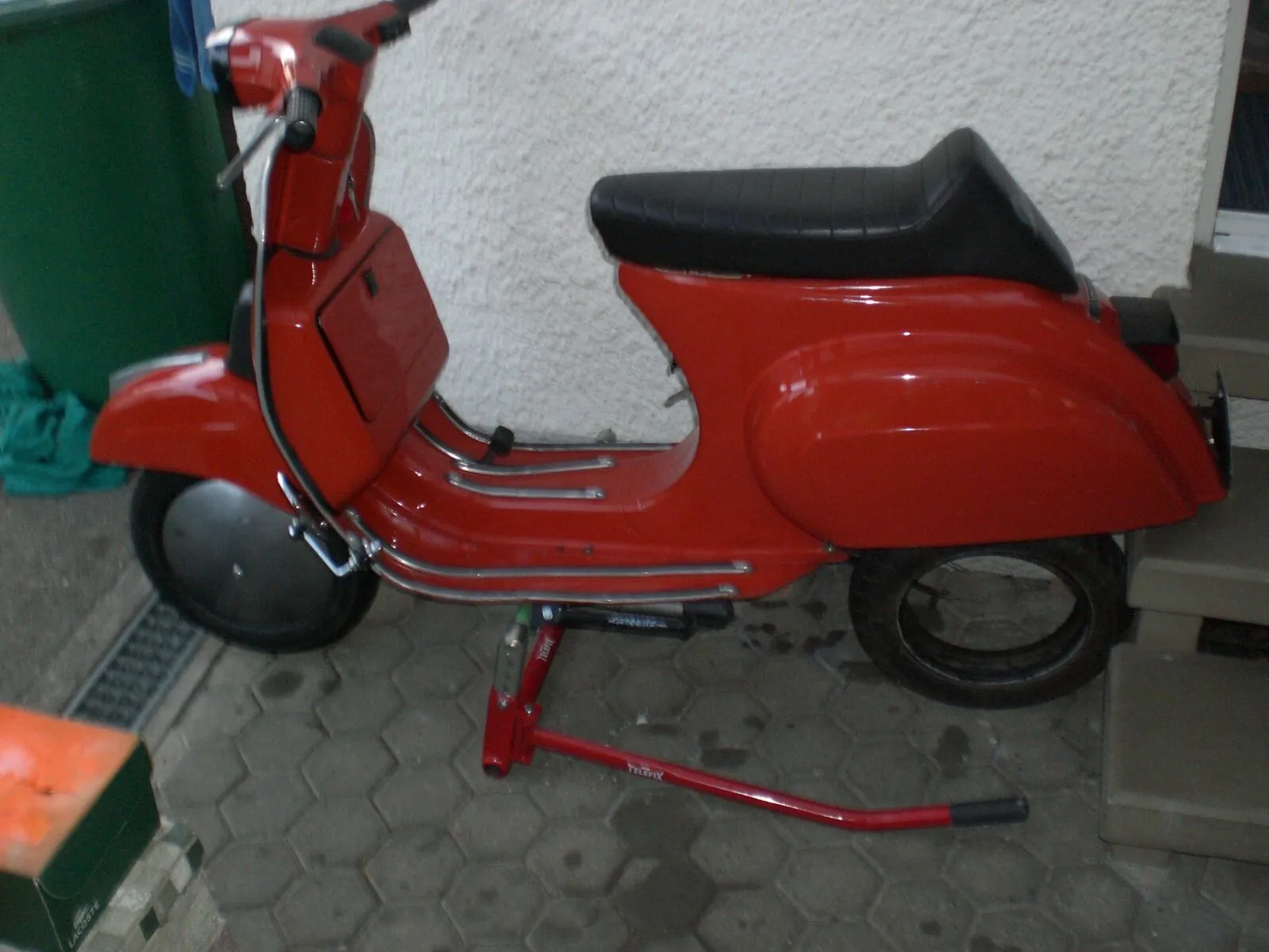 mit dem o-lack ists auch nicht mehr weit her. das tritbrett wurde hinten an beiden ecken neu angeschweißt und das beinschild wurde in der mitte auch nachlackiert(man sieht leichte übergänge)ich hab den roller ja per bild-zusage aus it mitbringen lassen aber bei dem preis kann man nicht meckern