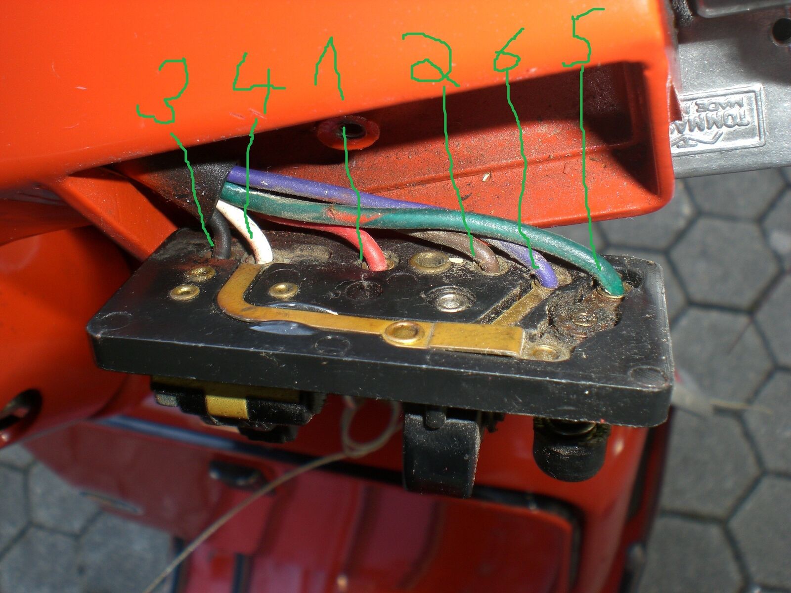 mein größtes problem ist der lenker. ich hab hier mal bilder des schalters und der anschlüsse, wie sie vorher verlegt waren.
