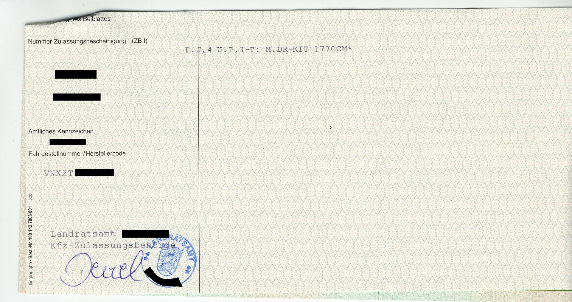 Wer kann mir sagen-woher ich entsprechende Briefkopie bekomme bzw wer im PLZ-Gegiet 9 oder 8 entsprechendes eintragen kann. Möchte dbei möglich wenig an der Vespa verändern- evtl. 24er Si mehr eigentl. nicht. Würd mich freuen-wenn ich durch Eure Hilfe weiterkomme.
