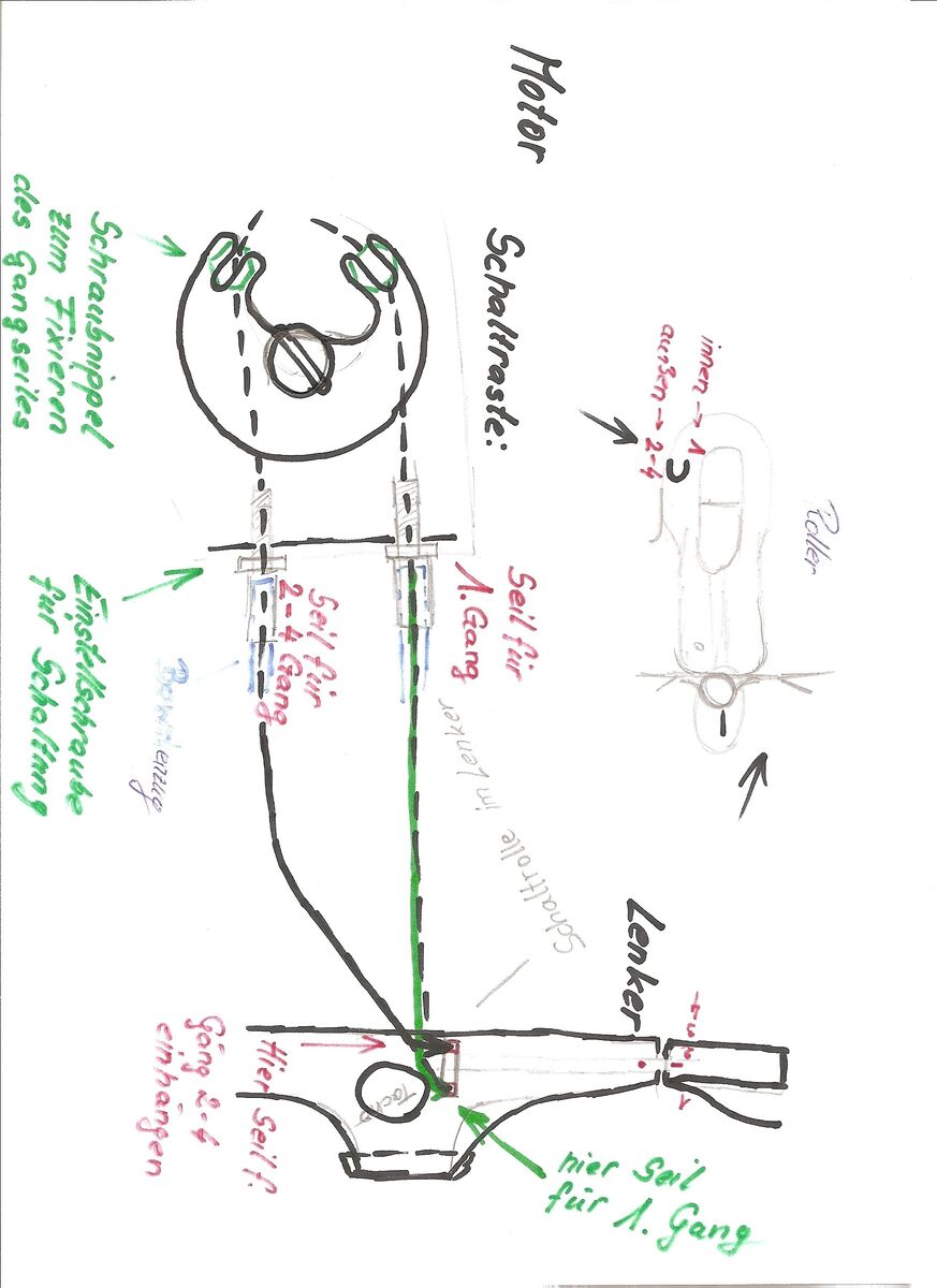 Hi, jetzt mit Bild. Dein Bild zeig die Ansich inrichtund des Pfeil 1. Die Schraube welches die Plastikabdeckung hällt sitzt hier (2) und der Schraubnippel sitzt hier (3). Nach dem Einbau den Zug soweit kürzen, daß der Platikdeckel wieder drauf passt. Wenn zu lang läßt sich der erste Gang nicht schalten. Das letzte Stück des Zuges zur Seite umbiegen.