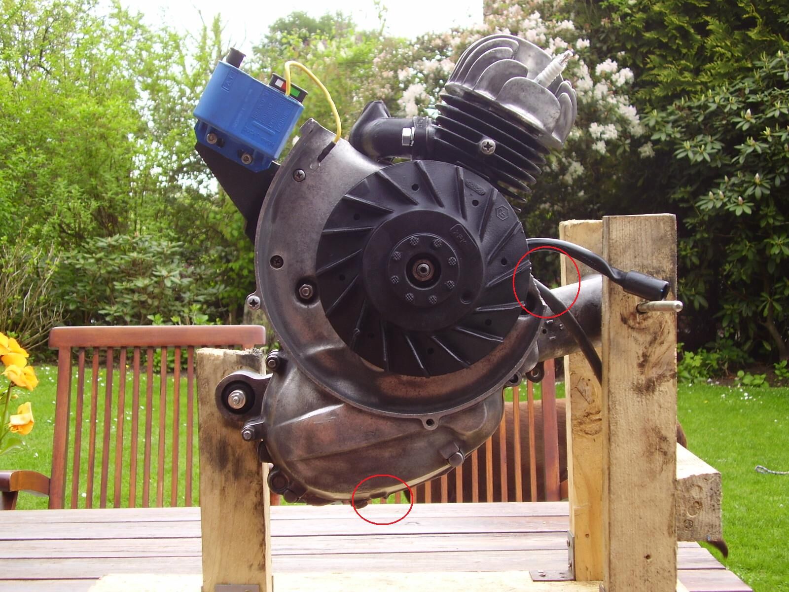 Jetzt bleibt nur noch abzuwarten, ob das Gehäuse dicht hält (sieht z. Zt. danach aus) und ob der Zylinder genug gekühlt wird. Leider sind am Motor zwei stellen vom gehäuse weg - einmal unten neben der Ölabl.schraube fehlt die Führung für den Gehäusebolzen - und oben neben dem Lüfterrad fehlt auch etwas vom Gehäuse. Hab die stellen mal auf dem Foto gekennzeichnet: