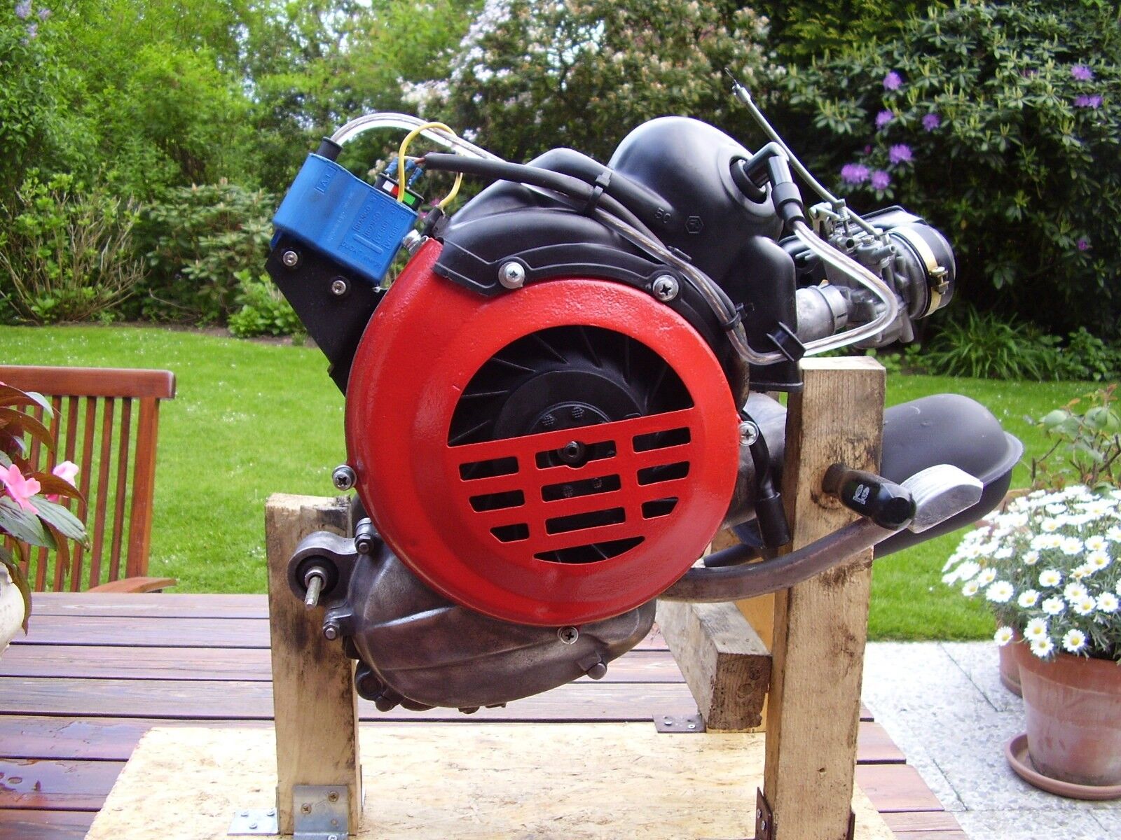Hier nun mal ein Foto von dem kompl. Motor. Die Lüfterabdeckung war nicht mehr so toll, eine neue hatte ich bei meinem Scooter-Laden nicht bekommen, da hab' ich Sie nun rot lackiert. Die Gummitülle von der Elektronikzentrale hab' ich beim letzten Einkauf vergessen, folgt also noch. Der Auspuff der dran hängt soll noch durch ne Banane :love: ausgetauscht werden.
