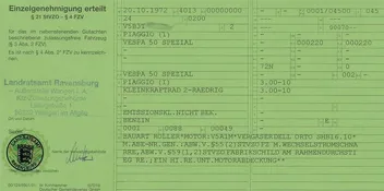 Da der Vorbesitzer sich nicht viel Gedanken um die ABE gemacht hat, war ihm eigentlich egal, was die beim TÜV eintragen. Auf jeden Fall stehen nun eine falsche Erstzulassung, Höchstgeschwindigkeit 45km/h und ein 16.10 Vergaser drin.![]()