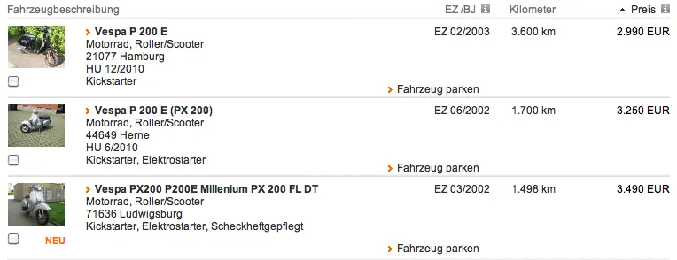 Mir wurde ne PX 200E mit 6300 Kilometern; Erstzulassung 2002 für 2450€ angeboten.