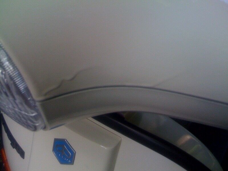 1) Der junge Mann hat den Roller selbst lackiert und leider ist ein bisschen was schief gelaufen. An ein paar Stellen hat der Lack "Nasen" und vorne ist wohl eine Fluse/Polle auf den nassen Lack gefallen. An manchen Stellen fühlt sich der Lack leicht rau an. Außerdem wurde der Roller zwar mit Autolack aber ohne Klarlack gespritzt.