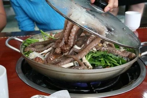habt ihr gemerkt das der calamar raus wollte bevor er gedünkstet wurde (er hängt am dekel)