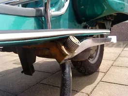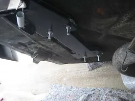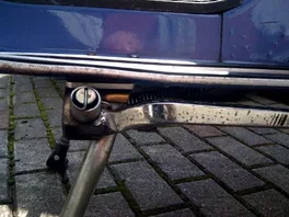 Zur Montage habe ich mir ein Blech (Bild 1+2) machen lassen (60mm stark), ähnlich wie dieses apothekenteuere E-Bucht-Teil. Man will ja keine Welle. Allerdings hatte ich beim Montageversuch das Problem, dass trotz der relativ dicken Stahlplatte die Feder des Seitenständers noch unten am Rand des Rahmens anschlägt. Leider habe ich nirgends ein genaueres Bild von einem montierten Ständer gefunden als das an der roten PX.