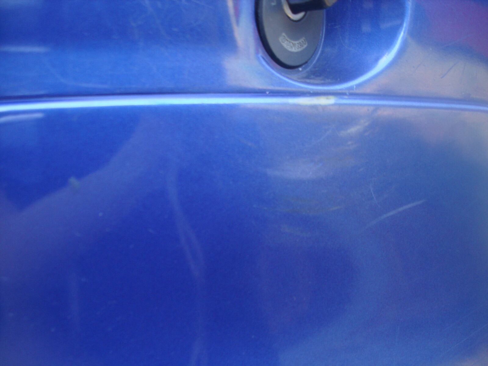 Da er mir mal umgefallen ist, gibt es eine kleine Beule unter dem linken Trittbrett und Lackschäden an der rechten Backe, die leider schlecht nachbehandelt wurden. An der unteren Vorderseite blättert die Farbe etwas, es gibt jedoch keine Rostschäden, auch nicht unter dem Trittgummi.