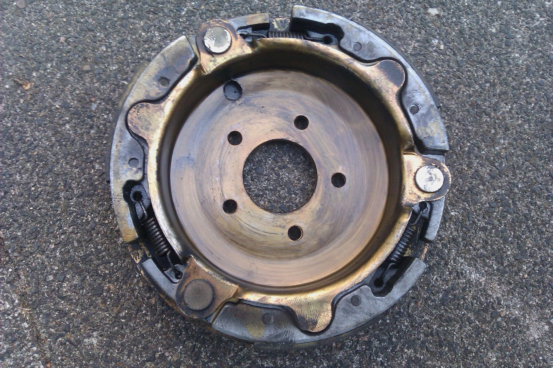 Was auf dem Bild so leicht unscharf nach 5 im Kreis angeordneten Schrauben aussieht, sind in Wirklichkeit Löcher, hinter denen sich Schrauben verbergen, welche die hintere Scheibe befestigen. Da komme ich aber nicht ran, solange die vordere Scheibe dran ist.