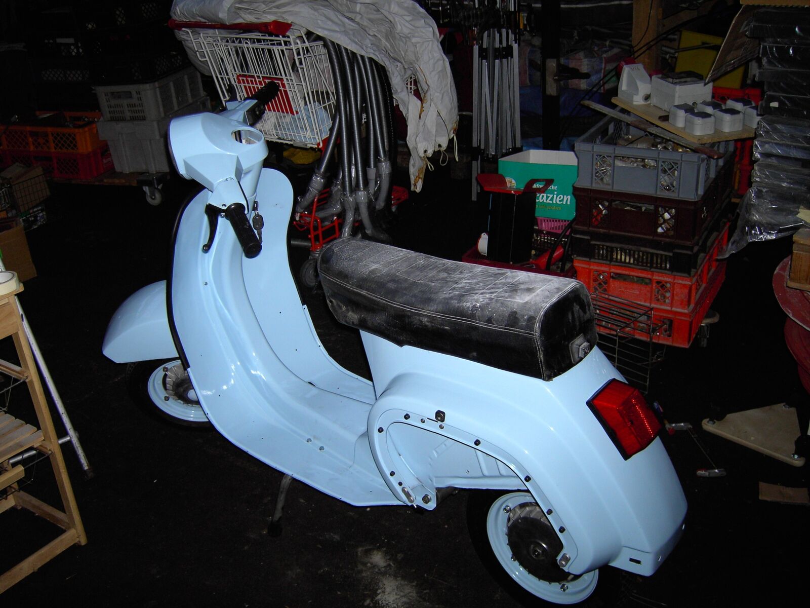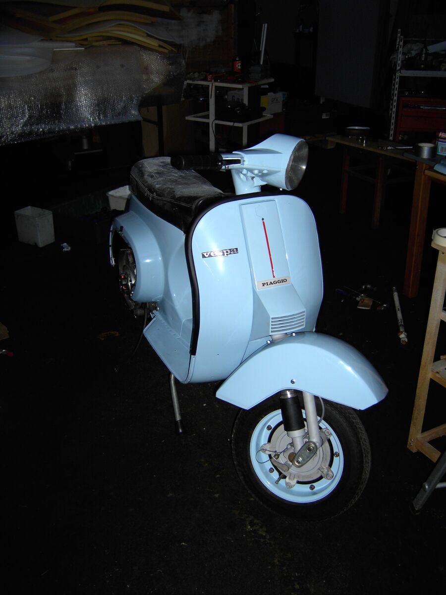 Beim Design habe ich mir auch schon meine Gedanken gemacht und zwar wollte ich mir die Vespa im „Hot Rod“ Design aufbauen. Also irgendeine matte dunkle Farbe mit roten Felgen, Weißwandreifen, schwarz lackiertem Motor + Gabel. Doch wurde von meiner Freundin auf einmal beschlossen, dass es jetzt ihre ist, weil ich ihr immer noch keine 50 N besorgt habe. Jetzt soll sie hellblau und nahezu im Originalzustand wieder aufgebaut werden.