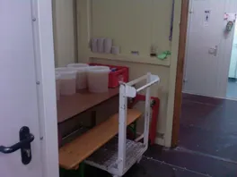 Auch nette Arbeitsbedingungen haben wir.16 Männer und Frauen teilen sich diesen Aufenthaltsraum.