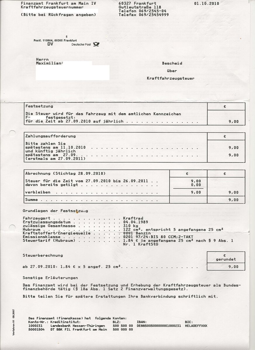 Ich: ich habe den Kraftfahrzeugsteuerbeschied für meinen Roller erhalten der..