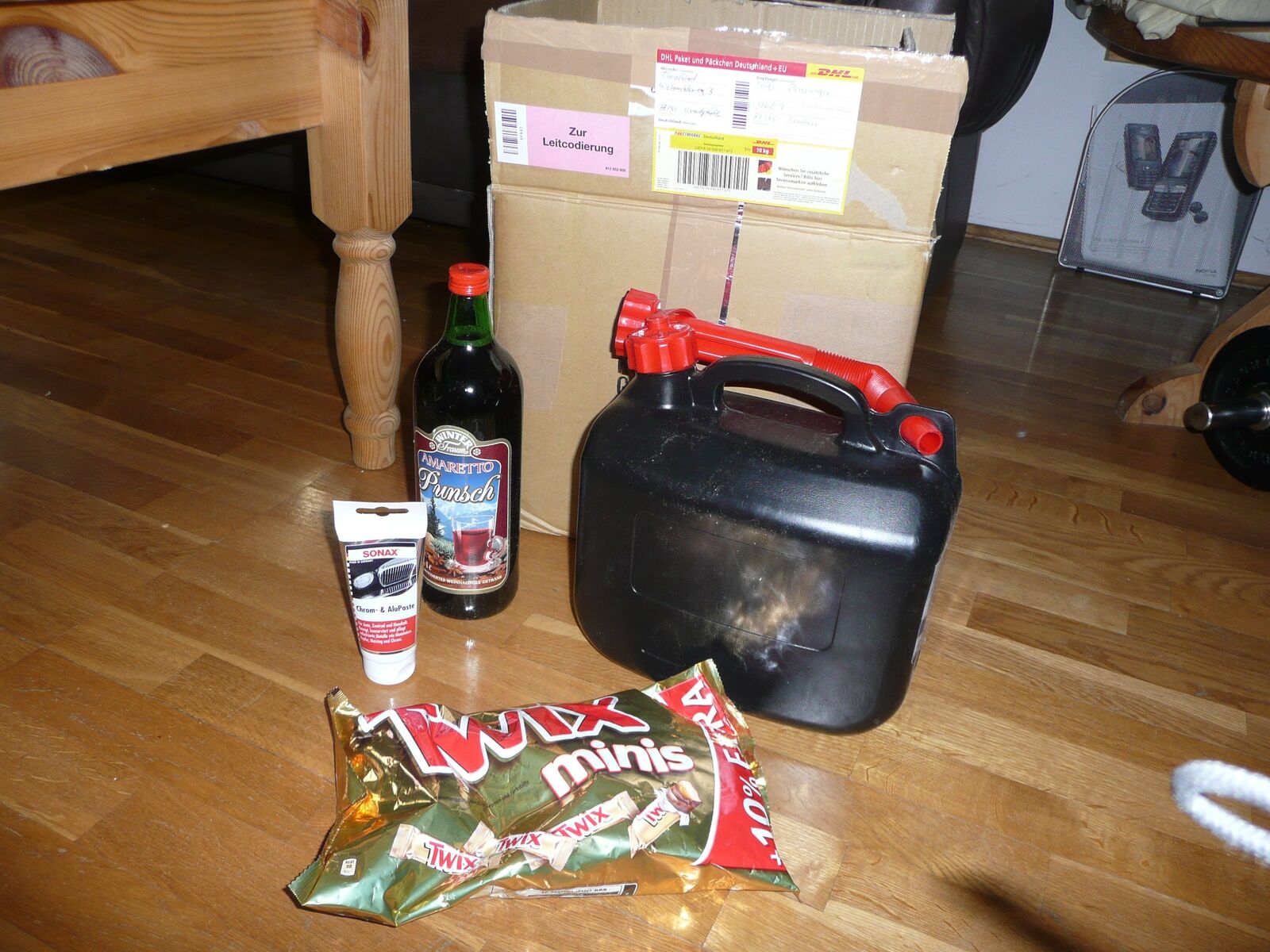 Ich danke für eine Dose Fleischwurst ;) in der sich wie man schon am schütteln hören konnte keine Wurst befand. Mit dem Dosenöffner geöffnet und reingeguckt: Tada ein Benzinfilter und passend zu meiner Vespa ein PX80-Anstecker.