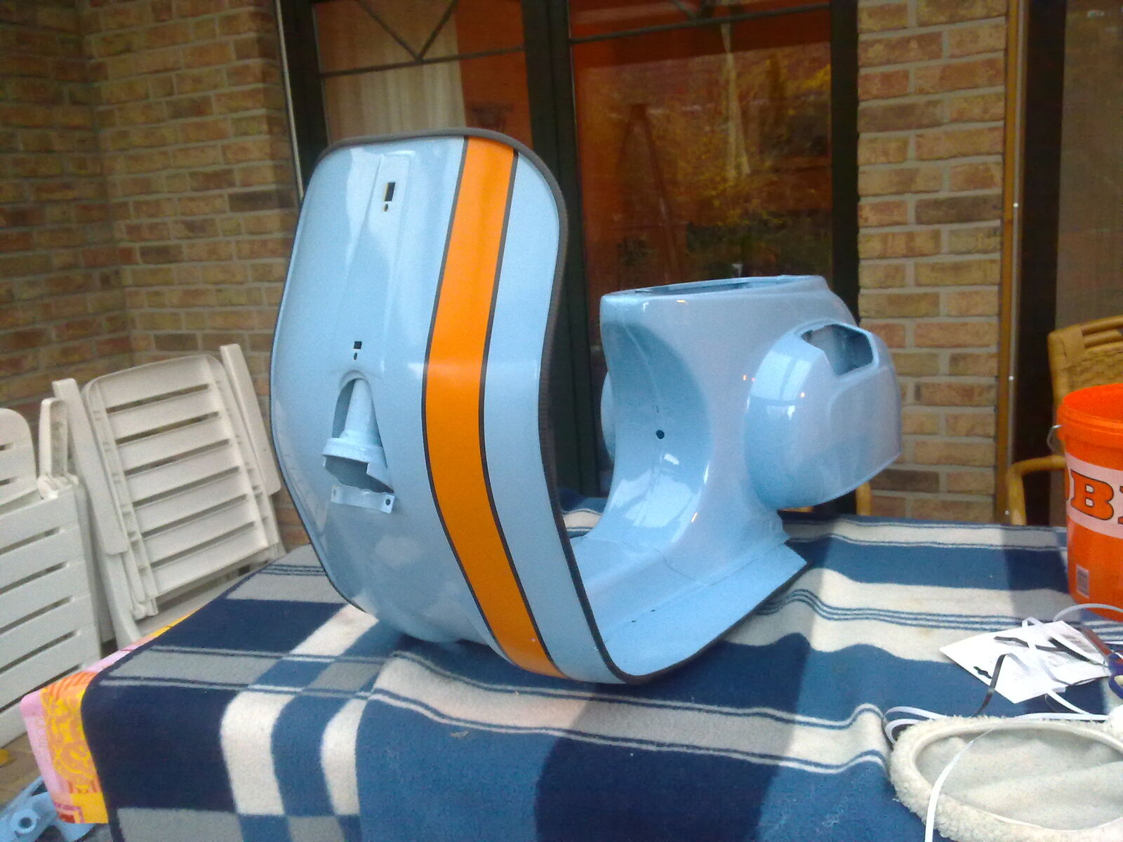 oder kauf Dir eine Repro Kaskade und mach die evtl. auch in Orange ( und evtl. noch zwei dünne Zierstreifen in der Rollerfarbe blau drauf ) oder die ganze Kaskade in Rollerfarbe blau...