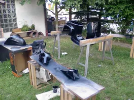 ich hab mir dazu einen spezialrahmen gekauft. ab damit zum sandstrahler, grundierung,lack im internet gekaut, kompressor und pistole ausgeliehen und bei schönem wetter den garten missbraucht! (nächstes mal investier ich in ne atemmaske. der lack in den nasenhaaren klebt ganz schön