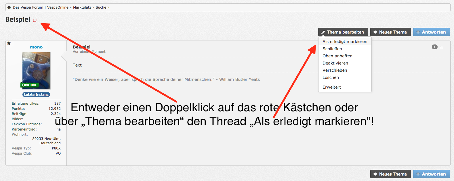 um ein einheitlichen Vorgehen bei erledigten Verkaufsanzeigen bzw. Suchanzeigen zu etablieren haltet Euch bitte an folgende Regeln: