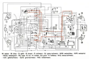 Was hast Du gemessen, Gleich oder Wechselstrom? Wo gegen hast Du gemessen? Die beiden Ladespulen für die Batterie hängen zwischen G und B+, und nur da kannst Du messen. Während die gelbe Leitung direkt von der Lima kommt, geht die zweite rote Leitung zum Zündschloss und von da über einige Punkte als weiße Leitung zum Laderegeler. Die wird nur geschlossen wenn "Zündung AN". Fehlermöglichkeitten gibt es da mehrere, z. B. Zündschloss, desssen Steckverbungungen, Zentrale Veirteilung, Stecker vom Motor zum Bordnetz (rund, rechte Seite der Schwinge), und natürlich die Kabel. Ich hab den Weg noch mal für Dich rot angemalt. Lima kaputt, unwarscheinlich, schlechte Verbindung wegen Korrosion oder Kabelunterbrechung warscheinlicher, durchgescheuerte Kabel sind auch möglich.