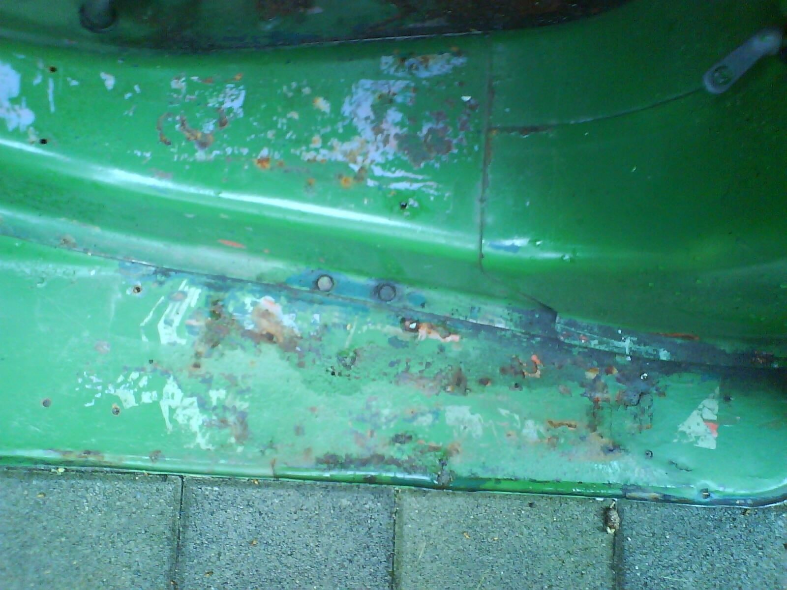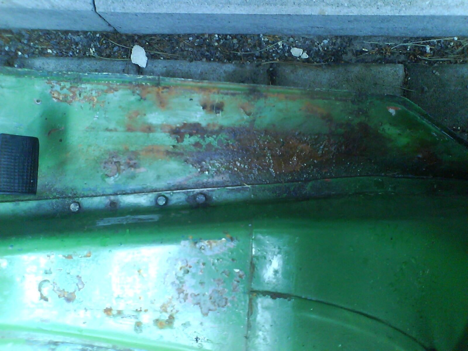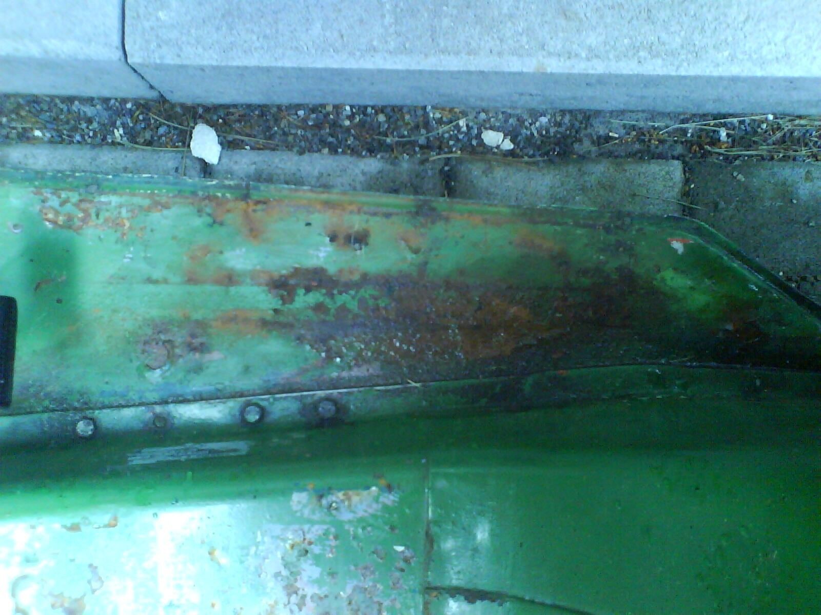 Diese sind am hinteren Ende besonders verrostet. Ein Riß ist schon zu sehen und das Metall ist dort auch relativ dünn. Man könnte den Rost schon mit einer Kruste vergleichen. Eine Komplettlackierung und alles was zur Vorbereitung dazugehört kann ich mir im Moment nicht leisten. Jedoch ist es dringend nötig an den Fußleisten den Rost zu entfernen, sonst hab ich gar kein Belch mehr.