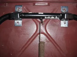 und wenn du eh schon am gucken bist, guck ma ob du an einen strebe nahe am motor an der karosse überhaupt 3 schlitze für das federmontageblech hast. weil wenn du den ständer mit 2 federn montieren willst brauchst du mindestens die 2 entsprechenden schlitze. und wenn ich mir deinen ständer so angucke musst da auch entsprechend 2 löcher für die federn bohren, das ist nämlich einer für eigentlich nur eine feder.