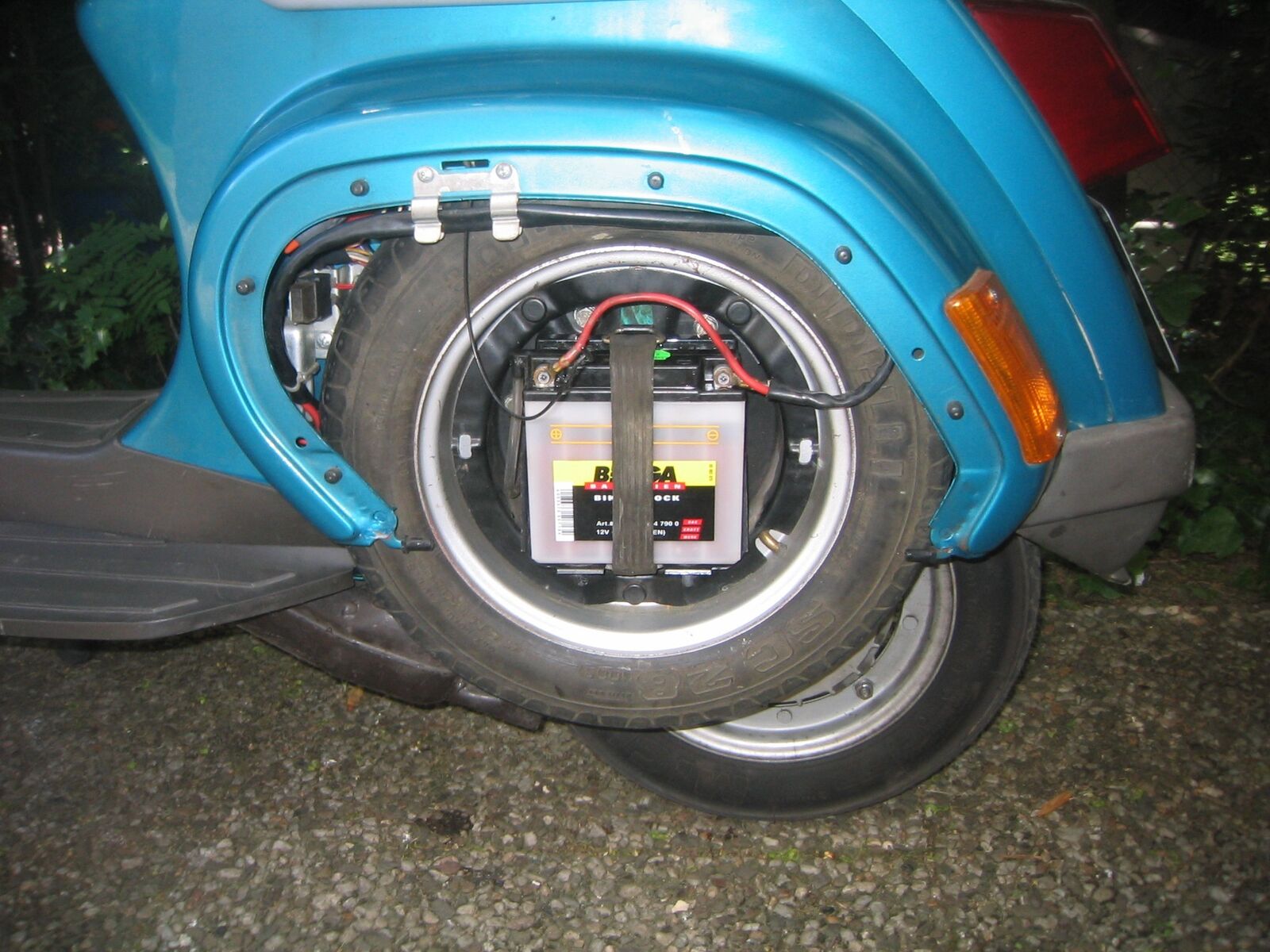 Nun habe ich meine Vespa repariert und alles angeschlossen. Und habe jetzt noch die Batterie herum fliegen.