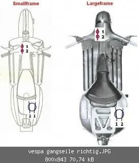 Habe mir das Ganze eigentlich ganz leicht vorgestellt, was es ja an sich auch ist, allerdings war mein Problem, dass ich beim Wechsel ein bisschen durcheinander gekommen bin, welcher Zug an welche Stelle kommt. Hab dann also meine Vespa hinten aufgebockt, sodass der Reifen schwebt, mich dann unter die Vespa gelegt und unten in der Schaltbox nochmal genau geschaut, welcher Gang drin ist, welche Richtung hoch und welche runter schalten ist. Habe dann dementsprechend die Züge eingehängt. Anschließend hatte ich dann aber das Problem, dass der erste Gang drin sein müsste, wenn ich hochschalte auch der Leergang reinspringt, als ich die Gute aber ankickte irgendwie der dritte Gang (vielleicht auch der zweite, aber fühlte sich beim Anfahren an wie der dritte) drin war. Habe dann auch nochmal die Züge umgekehrt eingehängt, weil ich keine Ahnung mehr hatte, was ich tun sollte. Umgekehrt kann ich vom "ersten" aber gar nicht mehr runterschalten am Lenker .. total blockiert dann! Und das Ganze habe ich, wahrscheinlich aus Verzweiflung, jeweils 2x gemacht ![]()