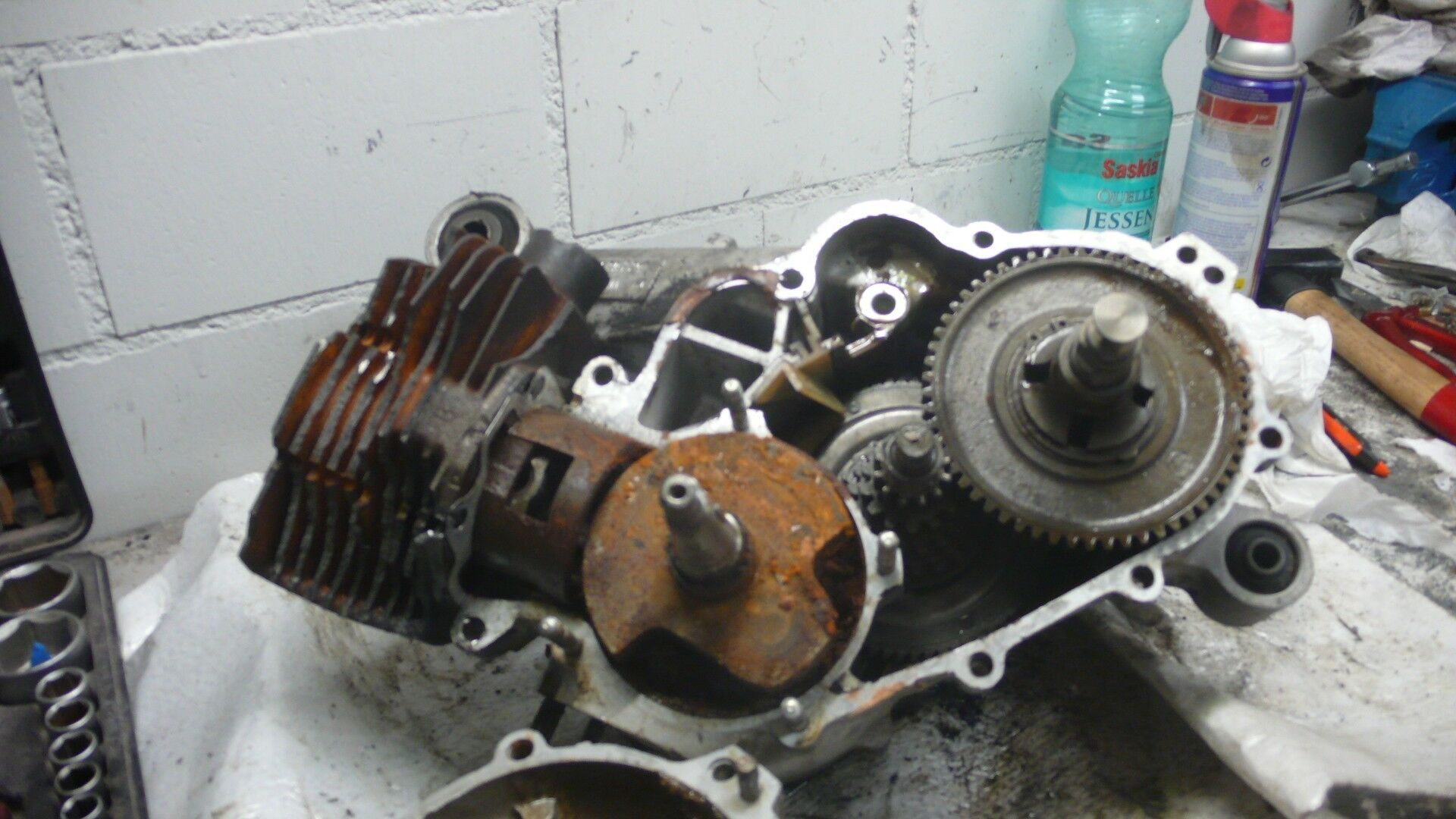 der zylinder musste ich runter schlagen da der kolben so fest drinn sass wegem dem rost macht er keinen wank und die welle ist auch total ungängig darum habe ich mit roher gewalt dahinter müssen ,,