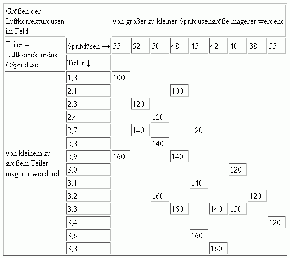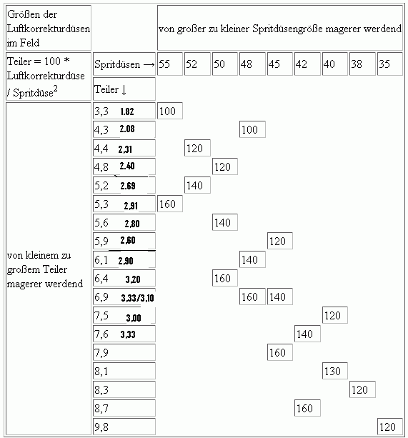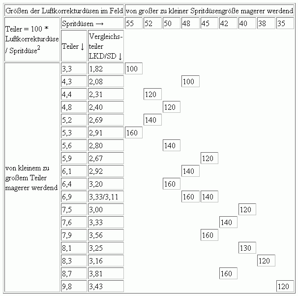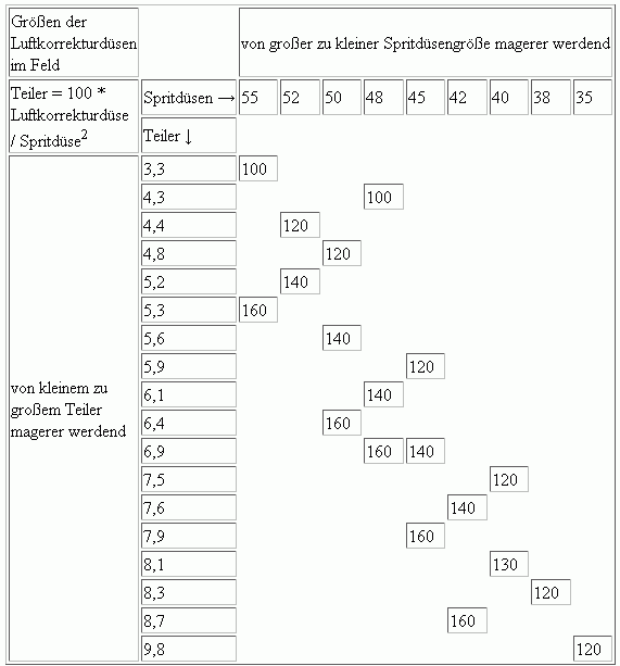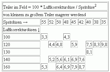 In der Tabelle sind oben die Größen der Spritdüse, links die Teiler und im Feld die Größen der ND-Luftkorrekturdüsen eingetragen.