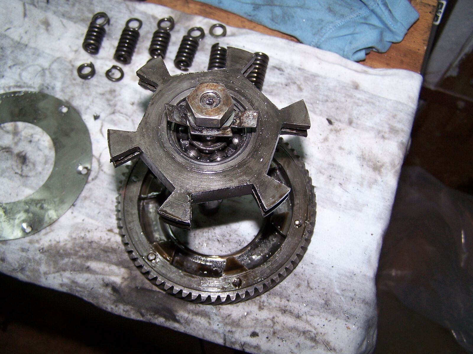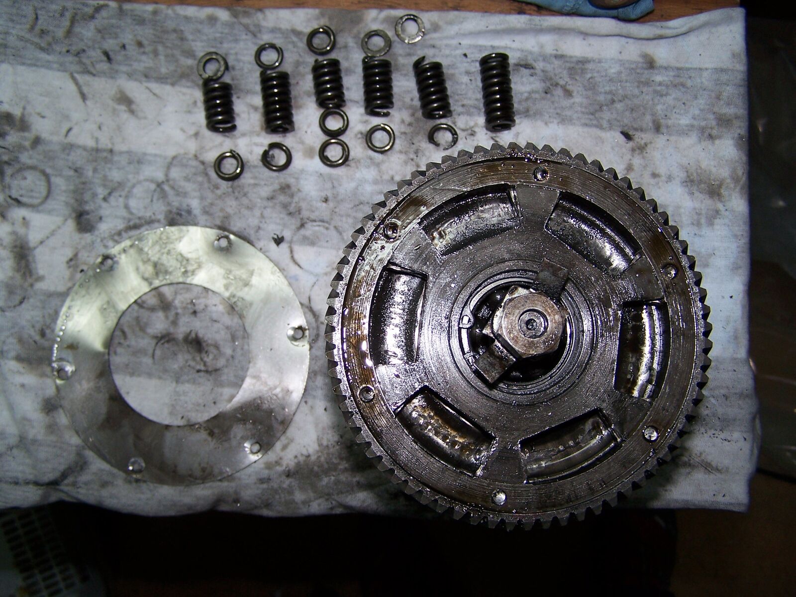 Hab die Nieten aufgebohrt 5mm Bohrer, bis Bleche sich gelockert haben; Bleche abgezogen; das Primärzahnrad auf dem Teilapparat in der Fräse eingespannt und Nieten plan gefräst; nun mit einem Zentrierbohrer möglichst mittig in die Nieten vorgebohrt; anschließend mit einem 3mm Bohrer durchgebohrt; beim Herausziehen des Bohrers sind die Nieten um den 3mm Bohrer gewickelt gewesen. Vier Federn waren zweimal und eine Feder dreimal gebrochen ![]()
