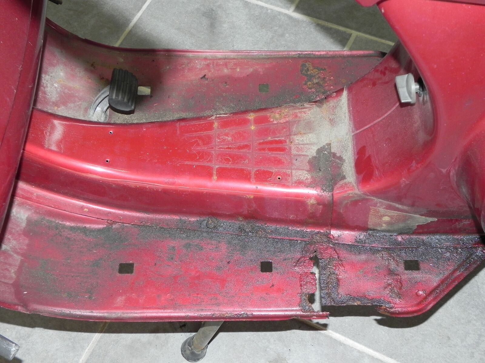 • die stellen im fußbereich kannst du auch wuderbar neu lackieren (lassen) ohne den gesamten roller neu zu lacken. auf bild zwei ist super die kannte zu sehen wo die bleche aufeinander treffen, der obere teil ( der bereich beim bezinhahn) sieht noch sehr gut aus. wenn du das blech jetzt schweißen lässt könntest du genau bis zu der kannte den kompletten innenbereich des beinschildes neu lackieren lassen indem du entlang dieser kannte die vespa komplett abklebst. wenn fertig ist wirst du es nicht mehr sehen das dort nachlackiert wurde...vorausgesetzt es wurde der ori. lack verwendet und ordentlich gearbeitet!!!