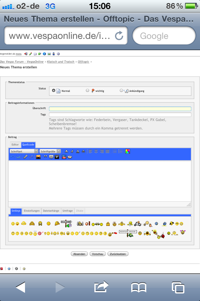 Im Gegensatz zu anderen Lösungen, welche voll auf das Look & Feel des IPhone ausgelegt sind, ist das Schreiben bei dieser Lösung für alle Samrtphones ohne weiteres möglich. Die mobile Version des Forum ist bedienbar wie die normale Version, nur in abgespeckter Forum. Einzigst die Möglichkeit zum Bilderupload fehlt.