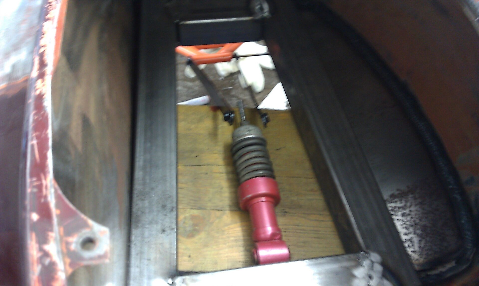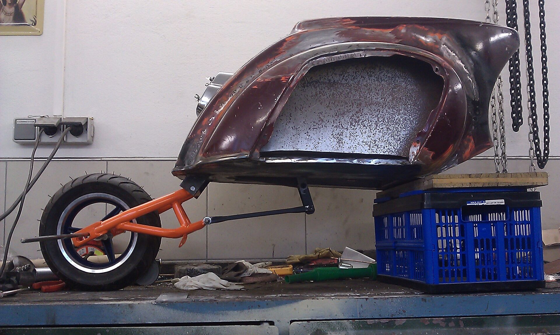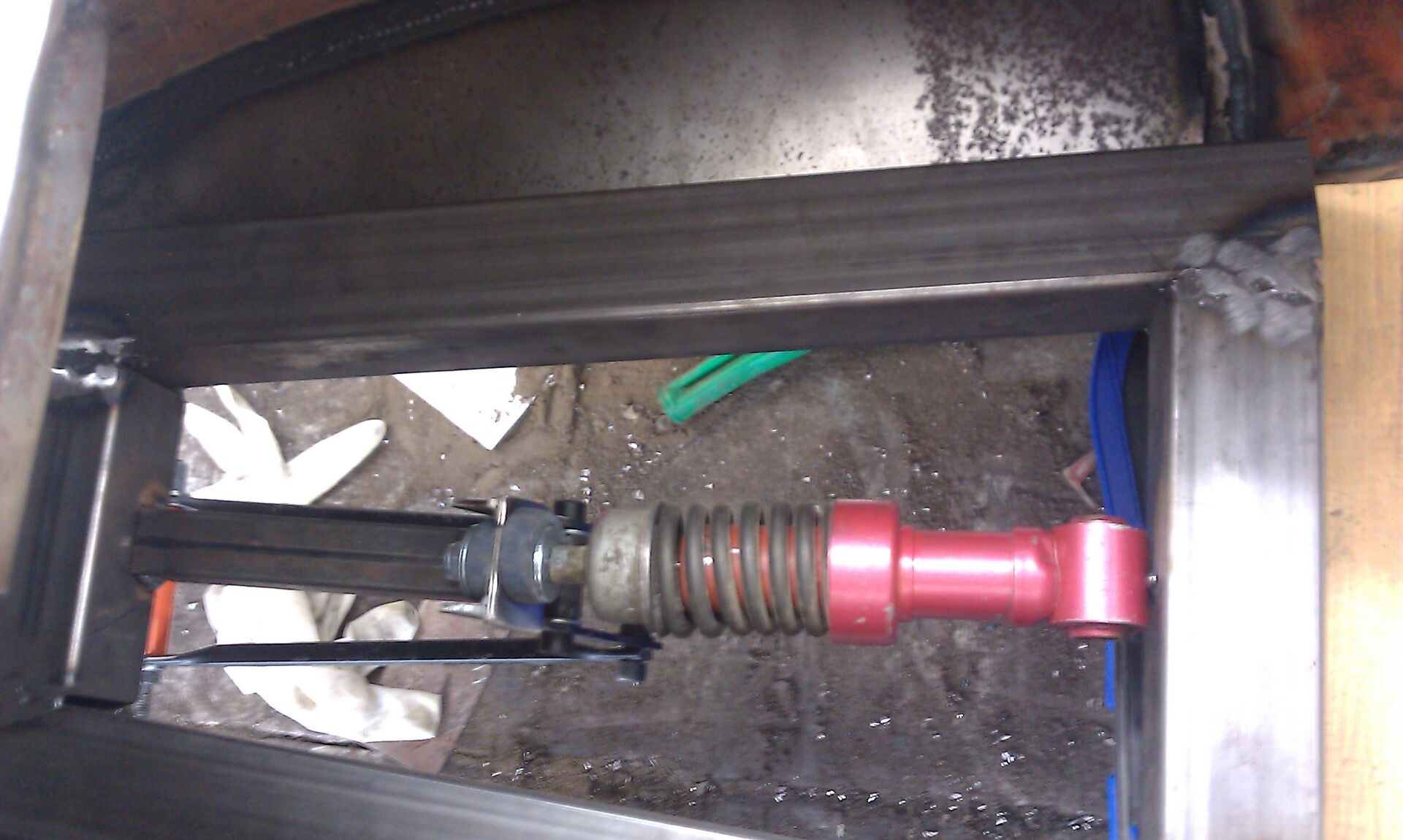 Doch einfach nur starr ein Rad dranbaunen is halt bei mir nicht, also schnell eine Federung gebastelt, mit Teilen von einem Dachtäger und der Autunno