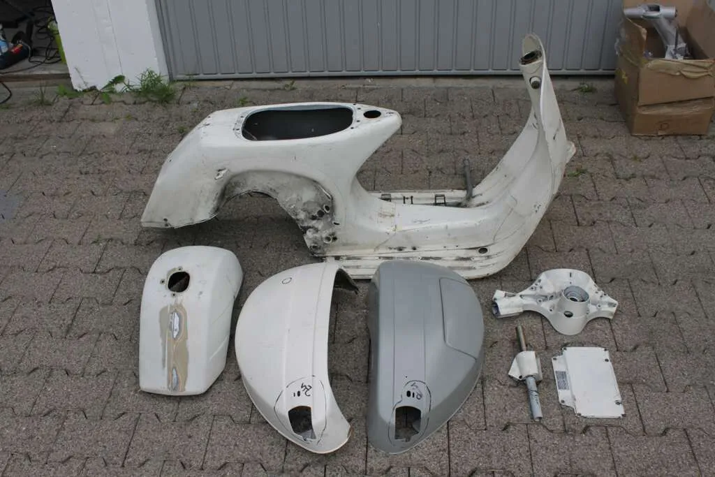• der helm ist leider zu groß, total veratzt und stinkt fürchterlich. Polsterung im Inneren ist ebenfalls weg! Aber fett ist er. Die Marke ist CGF. ... So die Vespa ist bis auf die Trittleisten demontiert, jetzt ab zum Pulvern, RAL 7009 ist angesagt (graugrün)... der komplette Dichtungssatz ist im GSF bestellt. Hoffe das Zeug taugt was.