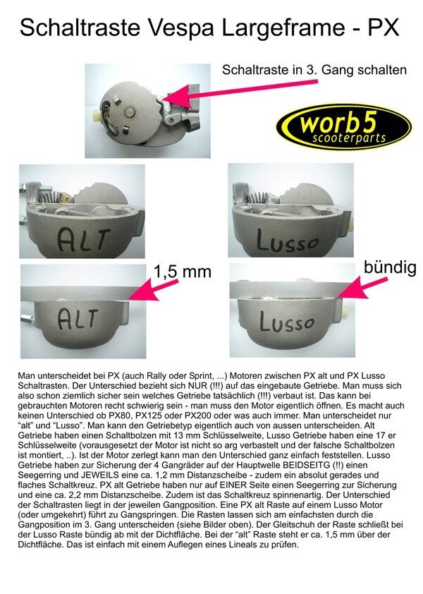 hab mir übern Winter eine PX125E mit Lusso Getriebe komplett restauriert und dabei auch den Motor neu gemacht. Sprich alle Lager, Dichtungen, Schaltkreuz, usw ... Das Rolle läuft nun auch schon einwandfrei ohne Probleme nur was mir auffällt ist das ich beim Schalten vom 2. auf den 3. Ganz bzw. vom 4. Gang auf den 3 Gang hin und wieder den Gang nur schwer oder mit viel gewalt rein kriege. Woran kann das denn liegen? Wie gesagt Schaltkreuz ist neu und ich glaube auch das richtige, hab den ganzen Motorrevisionssatz bei PX-performance bestellt.... Hin und wieder oder nach etwas längerem fahren und vielleicht unterschiedlicher Drehzahl geht der Gang auch mal leichter rein aber das ist eher selten....