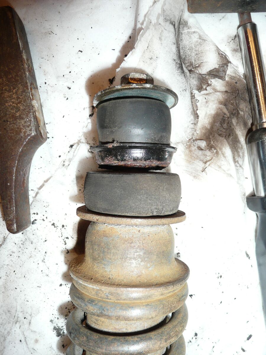 Oben sitzt die Schraube, dann ein Sicherungsring, auf dem Bidl nicht zu sehen, dann die grosse Unterlegscheibe dann der Gummipuffer