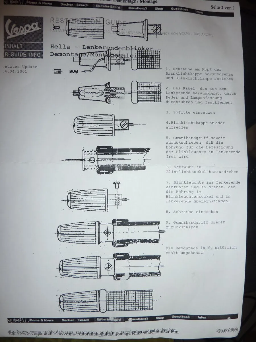 • Hi Leute , die Suche hat nix ergeben , jetzt seid Ihr gefragt . Restauriere grade ne v50 Bj 83 , hab den Rahmen und Lenker alles in Einzelteilen bekommen . Jetzt soll sie Lenkerblinker bekommen , die Innenrohre und die Teile im Lenker sind alle da , nur frage ich mich wie die Blinker aussen befestigt werden... Hat mal jemand Bilder davon ? ! Die Endkappen sind auch vorhanden schnall das grad nicht mit den löchern am Ende der Rohre . Die sollten überein stimmen für die Montage der Blinker und das tuen Sie aber nicht bei mir...