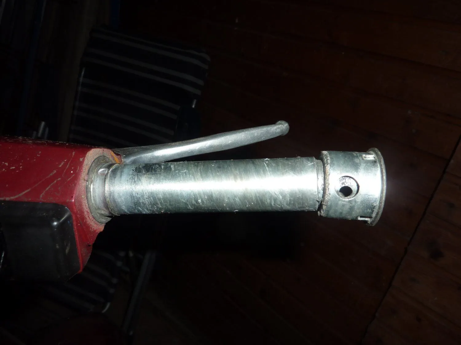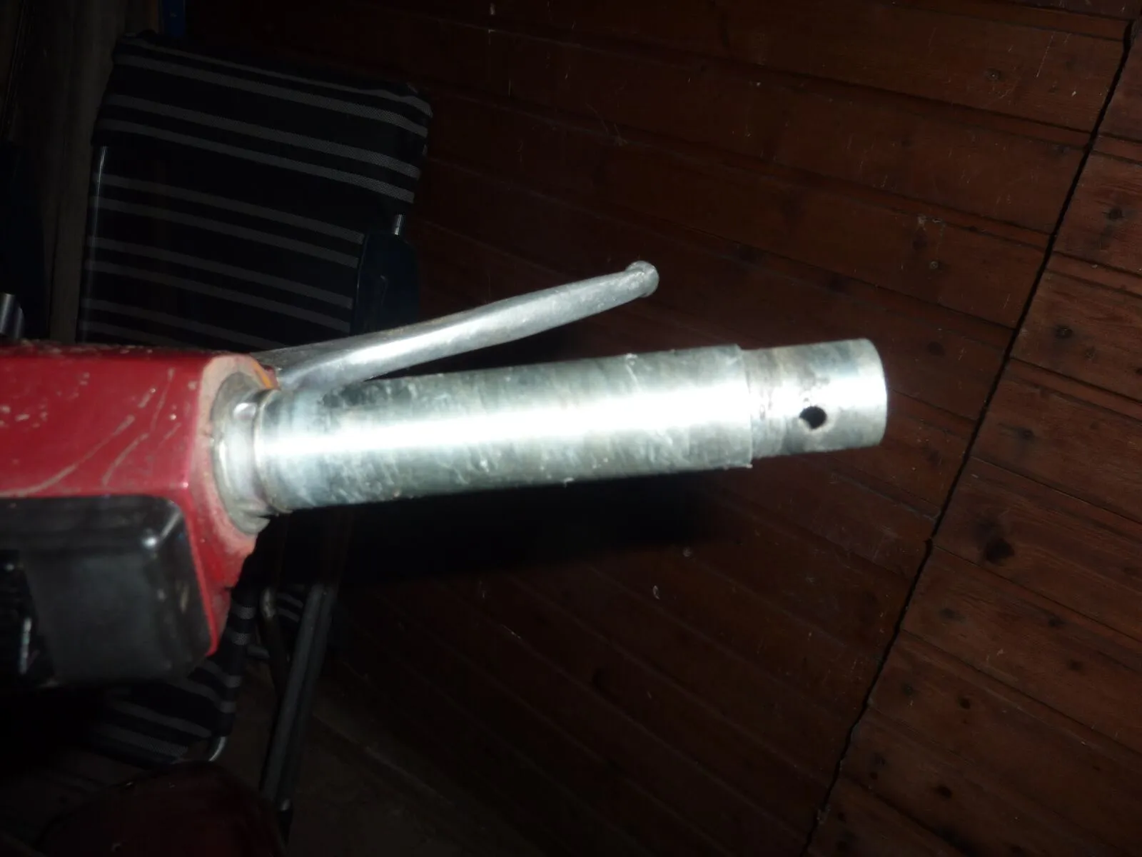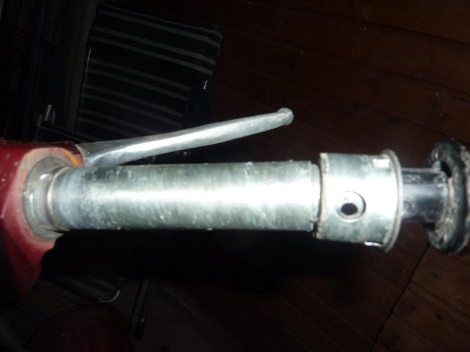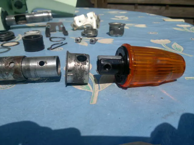 In deinem Bild 29052011300 siehst du das Loch im Innenrohr. Wenn du den Blinker reinsteckst wird er dadurch festgeschraubt. Dazu kannst du die Kappe, die vorher drübergesteckt wurde, so drehen das das Loch der Kappe so steht das du mit dem Schraubendreher drankommst. Und die Kappe stößt dann ziemlich genau am Außenrohr an. Deshalb vermute ich auch das du die Rohre vertauscht hast denn dein Rohr ist links zu kurz und rechts zu lang.