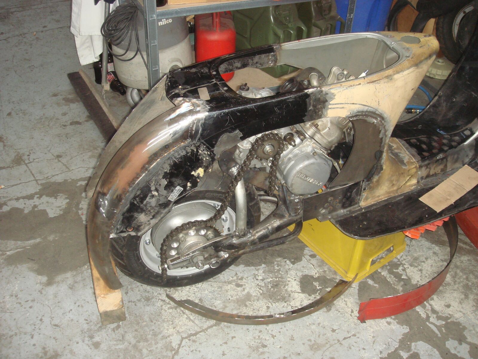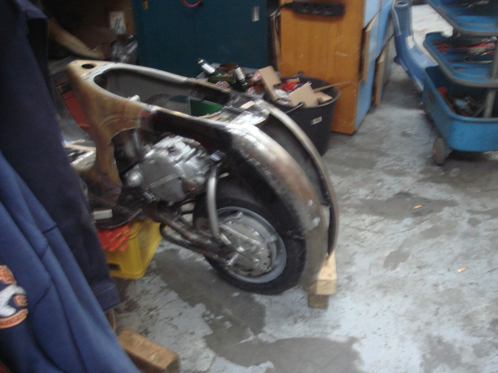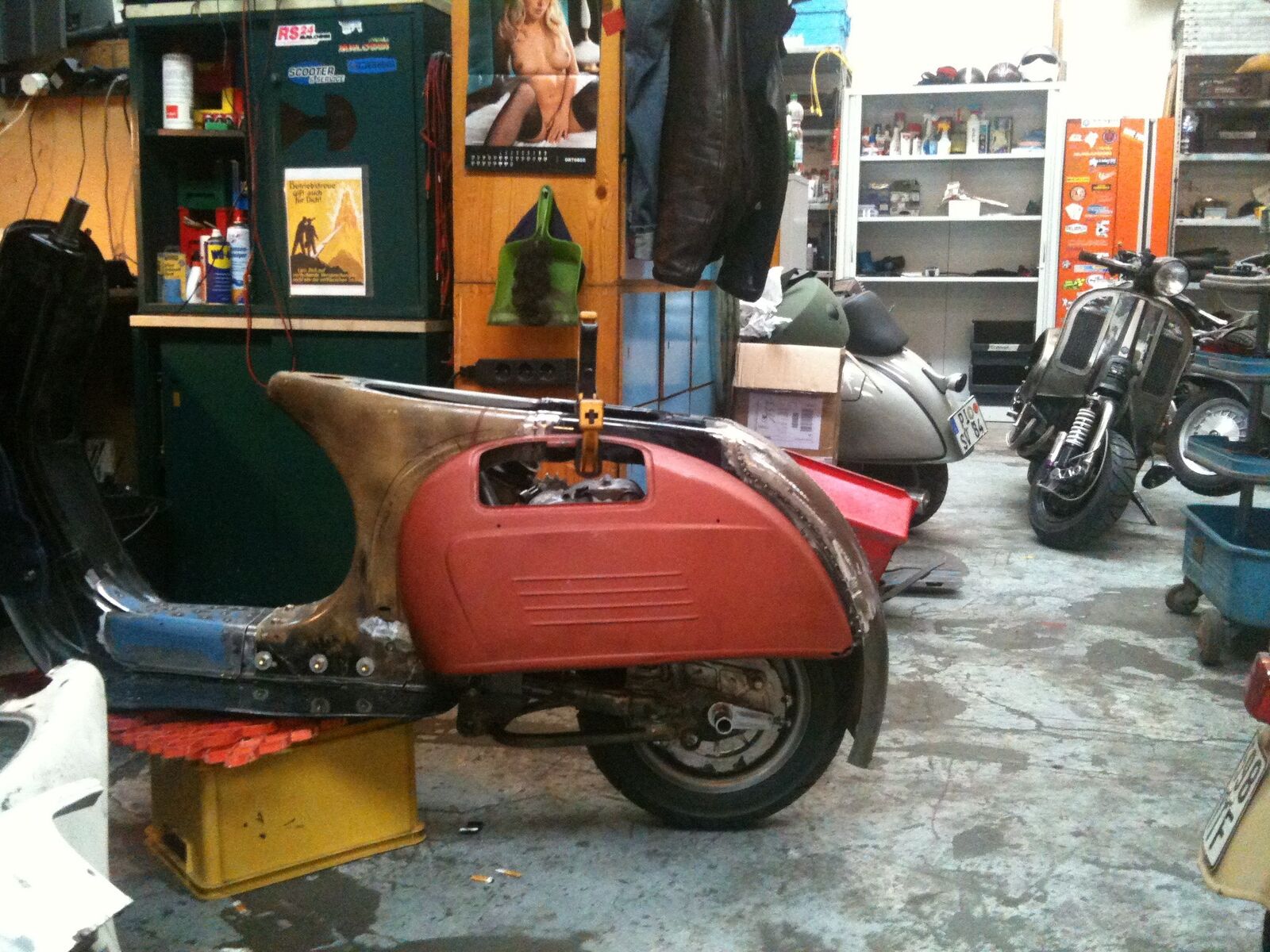 Mit 7 Bolzen ist das Heck nun angeschraubt und es lässt sich in knapp 60 Sekunden mit dem Akku Schlagschrauber lösen und abnehmen. Das Ganze ist dermaßen stabil, dass ich wohl den ganzen Roller am Heck unter die Decke hängen könnte. Ich überlege gerade auf die Heckstrebe zu verzichten. Jetzt bin ich dabei die Hauben vorzubereiten und zu positionieren. Allerdings überlege ich auch mich endlich an die hintere Federung zu machen. Wenn der Roller ständig auf einer Kiste steht, ist es ziemlich doof die Hauben zu positionieren, weil die Linie der Karre so nicht wirklich sichtbar ist... -