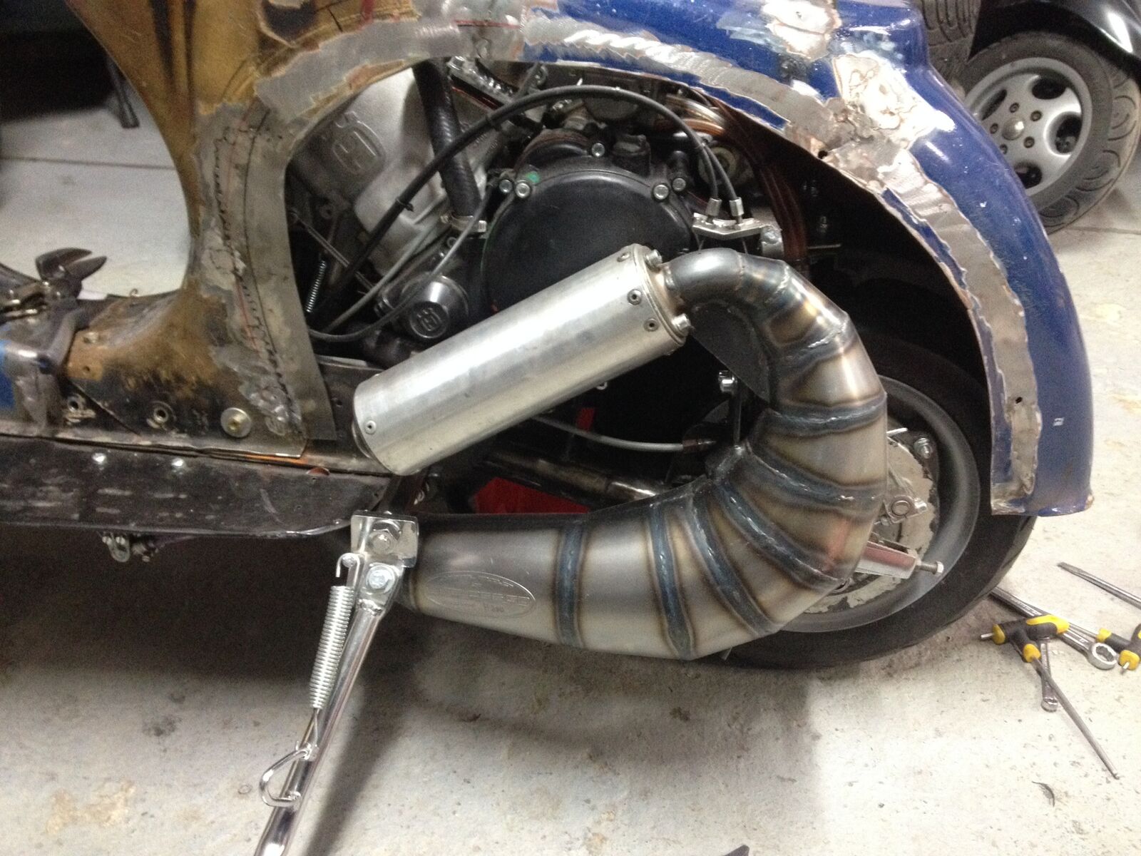 So hat das z. B. der Kollege mit der weißen Snowspeedracing-Falc-Special für seinen fetten Auspuff gelöst, sieht gar nichtmal so Kacke aus. Bilder von der Karre schwirren durchs Internet, z. B. von der Customshow beim Meltdown oder älteren SCK Open Days.