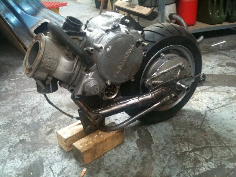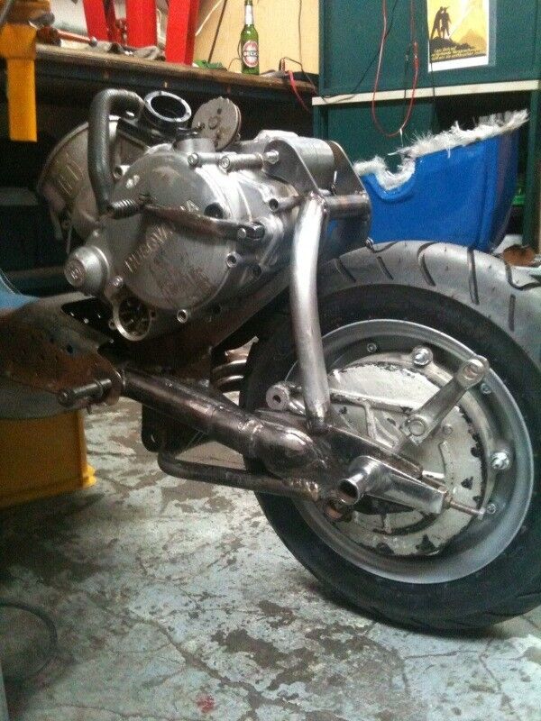 • 2 kg Stahl gehen da noch rein. Dann kommt noch das Kühlwasser und der Auspuff und weil das alles ungefederte Massen sind wird´s für den Dämpfer eine echte Herausforderung