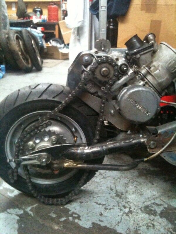 Endlich ist der Motor auf der Schwinge fest. Das war ein ganz schöner Krampf das Ding so auszurichten, dass das Ritzel in der Flucht zum Kettenblatt liegt. Vorher musste ich noch das Hinterrad genau ausrichten, was sich auch noch mal ein wenig in die Länge zog. Wer die Werkstatt kennt in der ich schraube, weiss, dass der Schweissraum im im ersten Stock liegt und ich somit das ganze Geraffel nach oben schleppen musste um dort wieder alles genauestens auszurichten. Genug Blabla. ich lasse Bilder sprechen.