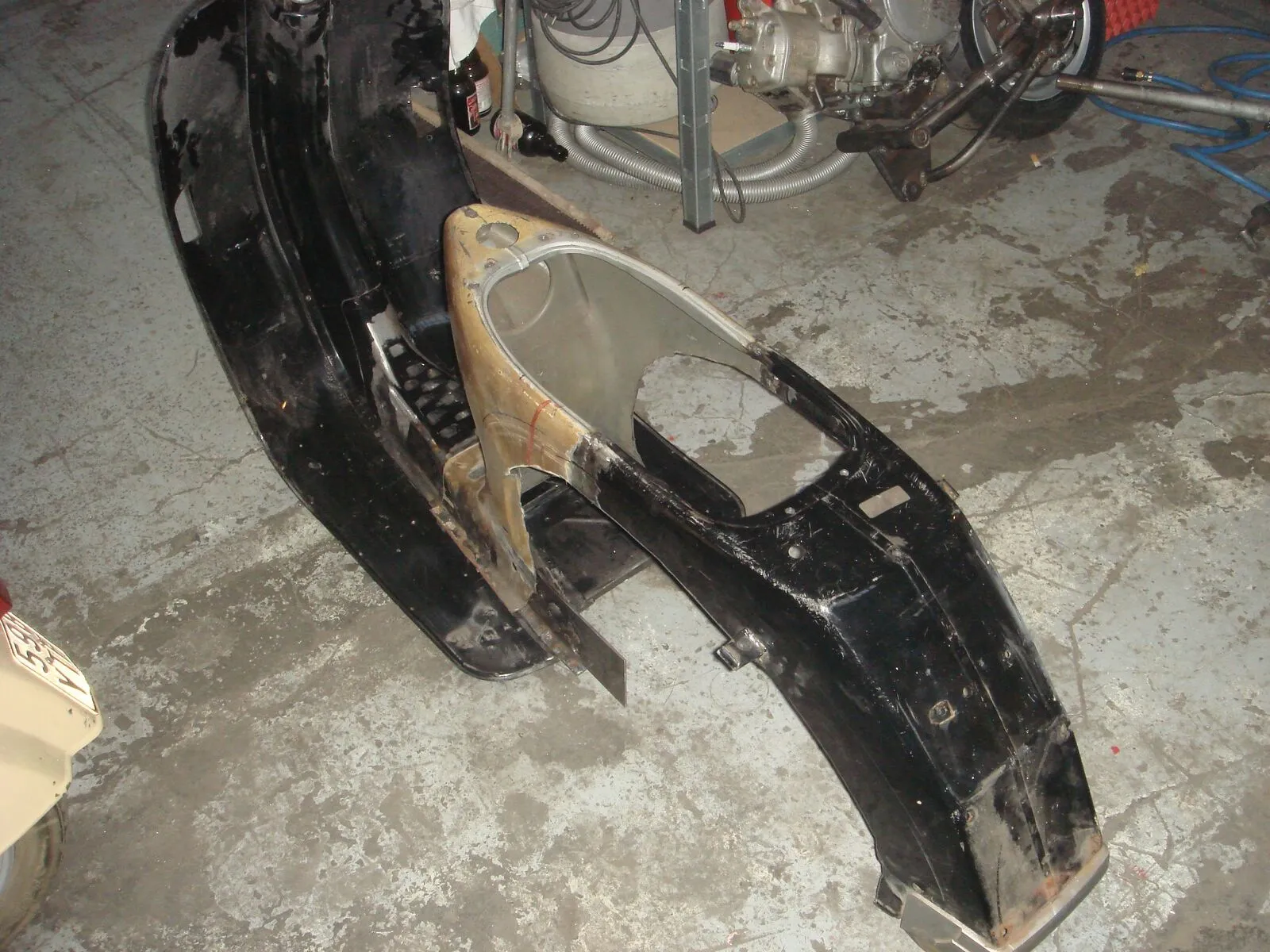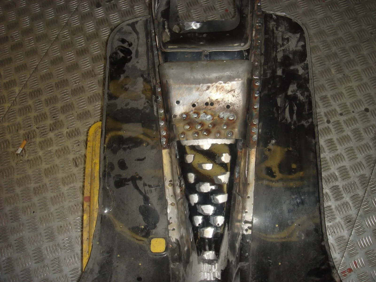 Das Rahmenheck ist ja nun 12 cm länger. Aber es wird auch ca. 4 cm weiter vorn positioniert. Das lässt eine hässliche Kante auf dem Mitteltunnel erwarten. Bei einer Flasche Bier kam mir dann die Idee, die gleich mehrere Probleme auf einmal löst. Ein weiterer Tunnel wird so aufgesetzt, dass das Rahmenheck saugend-schmatzend auf diesem Stück aufliegt. Der Spalt links und rechts beträgt dann noch 3 mm. Die reichen aus für die Heckstrebenaufnahme und Krafteinleitungsverstärkung (auf dem Bild noch als Pappschablone).