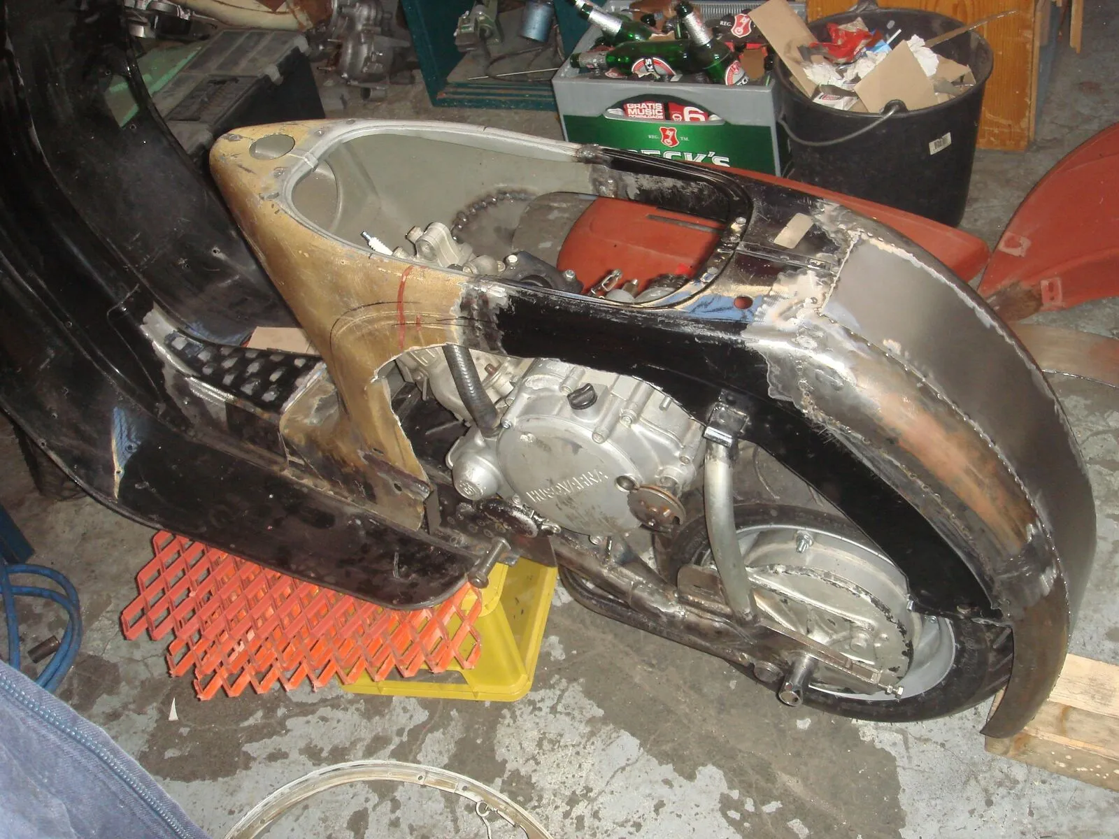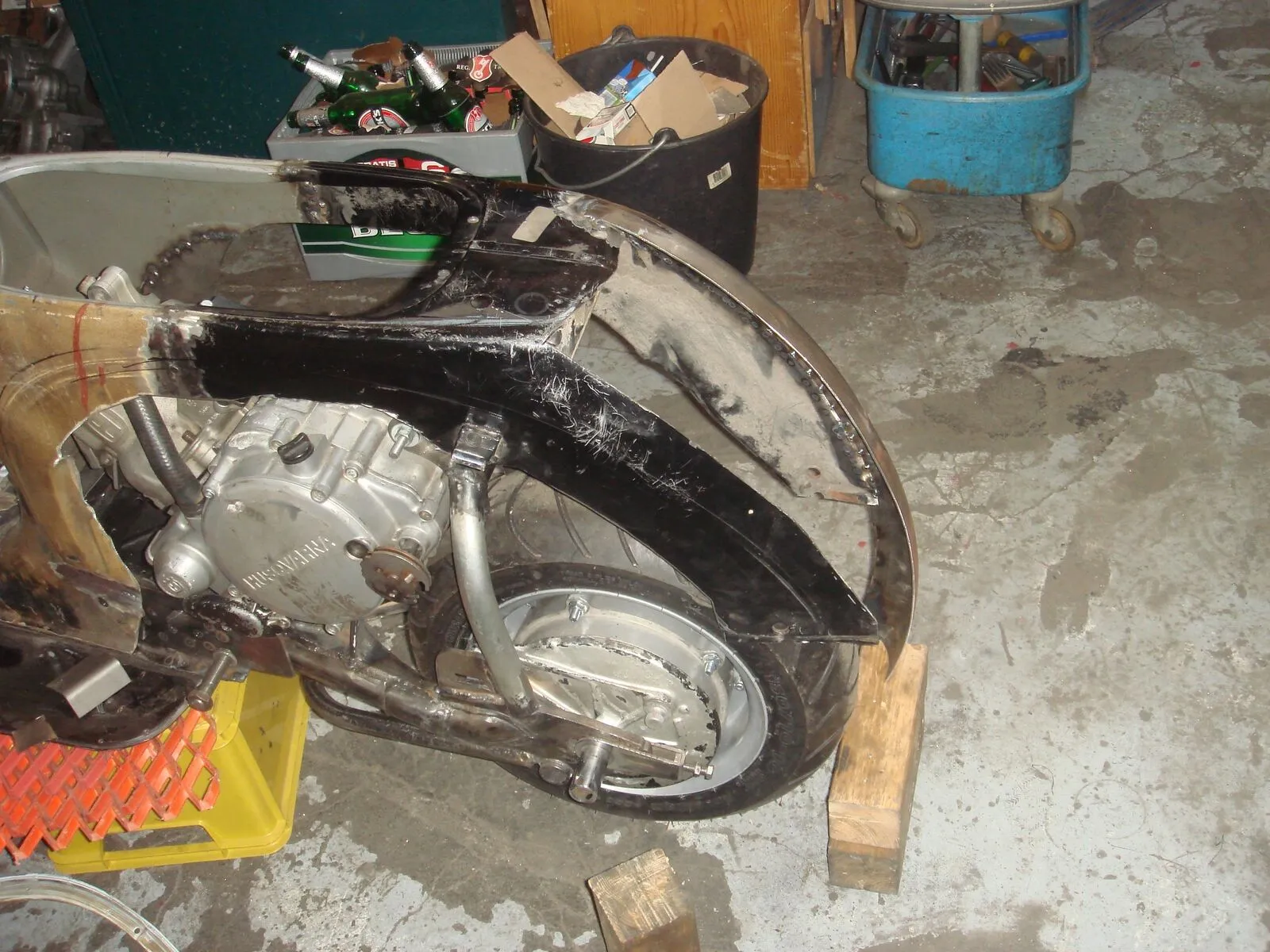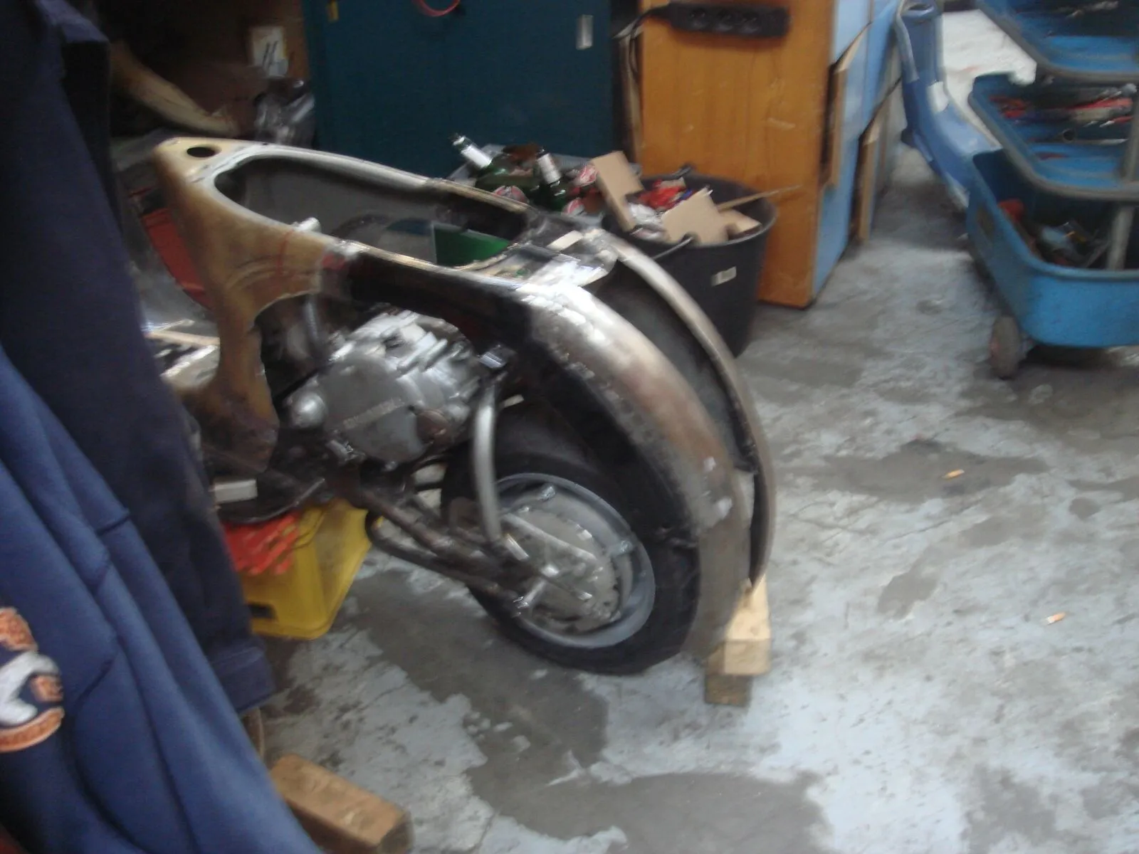 Mit 7 Bolzen ist das Heck nun angeschraubt und es lässt sich in knapp 60 Sekunden mit dem Akku Schlagschrauber lösen und abnehmen. Das Ganze ist dermaßen stabil, dass ich wohl den ganzen Roller am Heck unter die Decke hängen könnte. Ich überlege gerade auf die Heckstrebe zu verzichten. Jetzt bin ich dabei die Hauben vorzubereiten und zu positionieren. Allerdings überlege ich auch mich endlich an die hintere Federung zu machen. Wenn der Roller ständig auf einer Kiste steht, ist es ziemlich doof die Hauben zu positionieren, weil die Linie der Karre so nicht wirklich sichtbar ist...