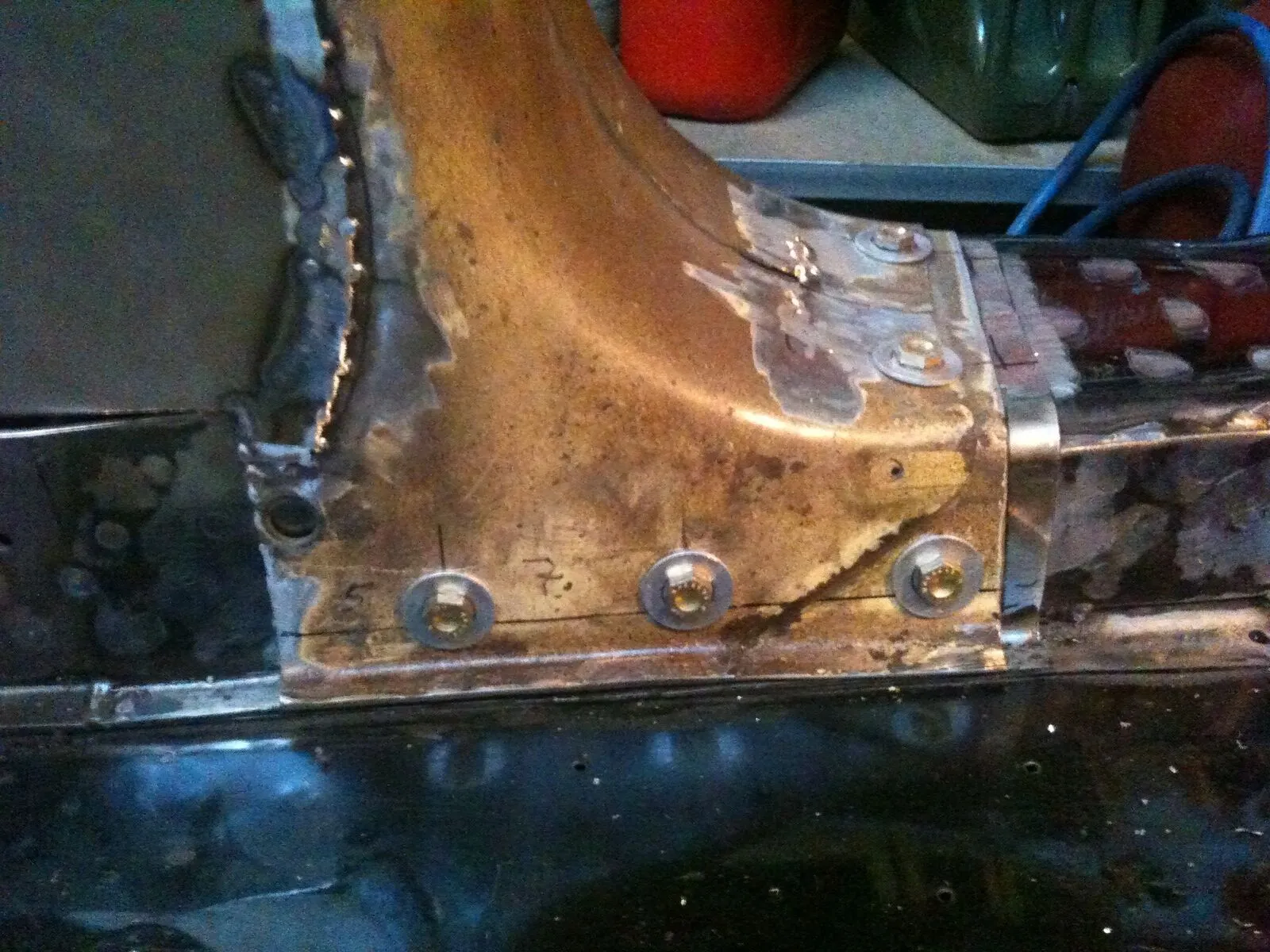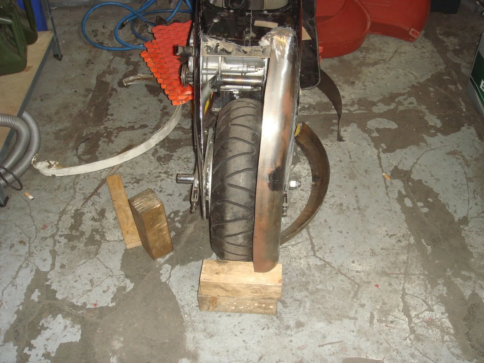 Dann kam mir da der alte Harleyfender, unter meiner Werkbank, in den Sinn... Gut, das Mistding ist aus 2mm Stahl, aber man kann es ja mal versuchen. Gegen Abend war es dann vollbracht.