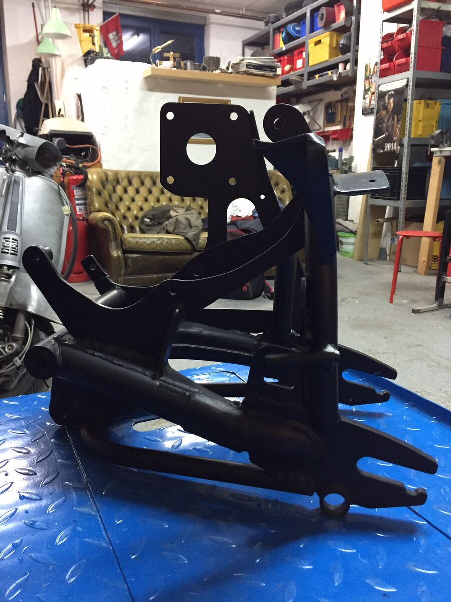 Ob es was taugt wird sich zeigen, wenn es hält sind 165 Euro nicht zuviel.Die Schwinge habe ich erstmal Mattschwarz dünn lackiert, so lassen sich Risse im Stahl gut erkennen. Mir fehlt dann doch das Vertrauen in meine Schweissarbeiten....