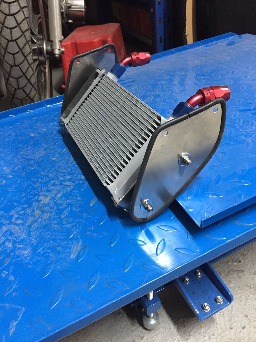 Tatsächlich sitzt der Kühler unter dem Bodenblech und der Kantenschutz ist gar nicht mal so billig anmutend wie vermutet. 1.5 mm Edelstahlblech jetzt ohne Keder anzubieten hätte ich aber auch doof gefunden. Er ist ja sonst fix abgezogen, wenn es denn so übel aussieht.