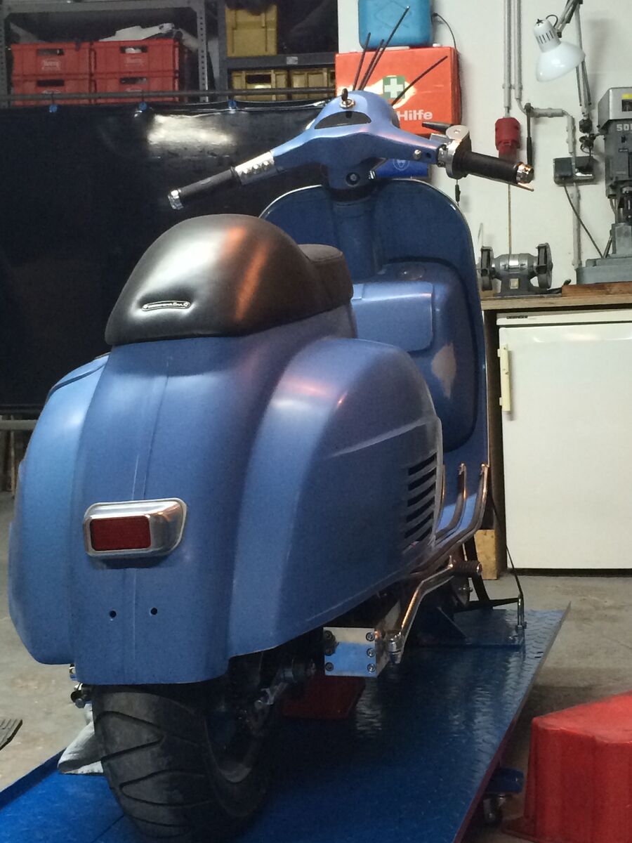 Der Plan ist jetzt den Roller zusammenzubauen und dann mit dem Pinstriper in medias res zu gehen. Eine Option ist das Blau so zu lassen, eine andere es fein stellenweise durchzuschleifen bis das Grau (soll dann wie Grundierung aussehen) durchkommt. Dazu Kratze, Schmutz und eine Mattierung. Pin Striping und Lettering werden entsprechend angepasst. Es stehen einige Themen zur Wahl- Ace of Spades