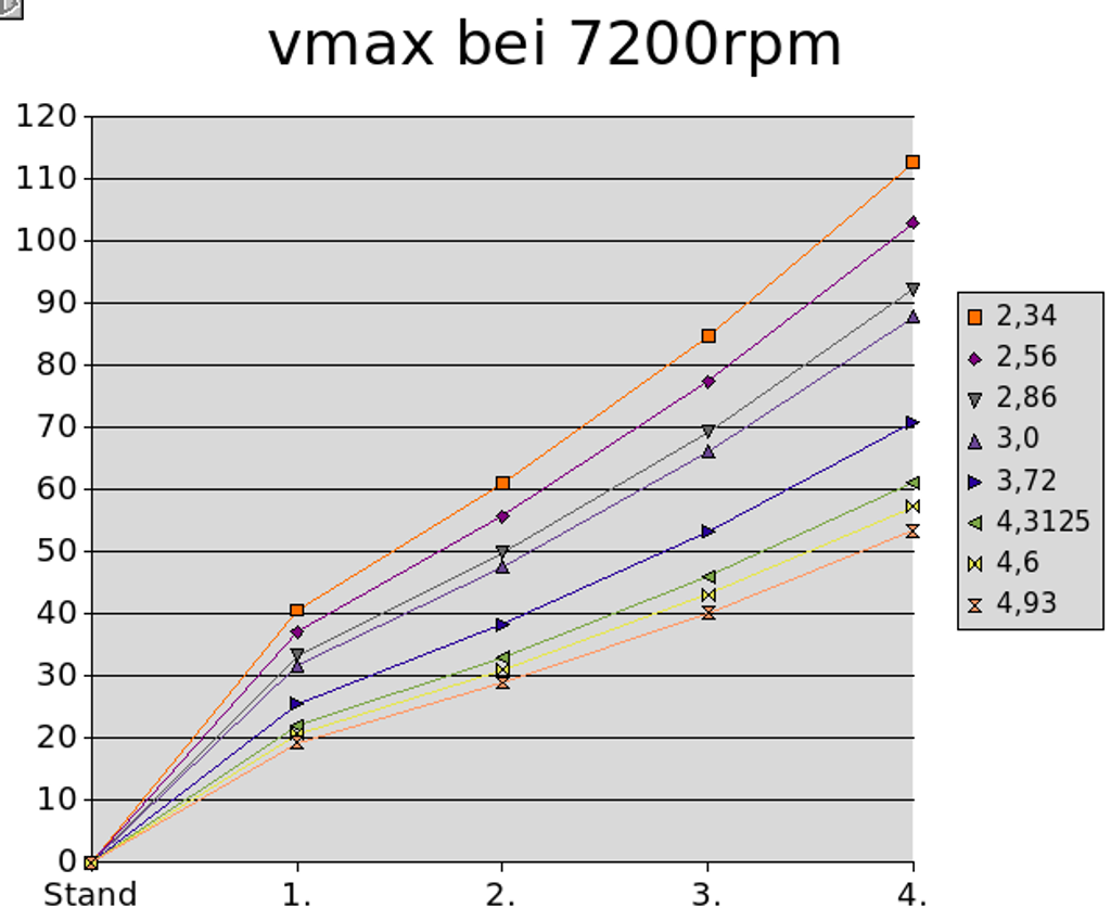 Je nachdem, ob du original 14 oder 15 Primärzähne hast, ergibt sich ne Übersetzung von 4,93 oder 4,6, das Pinasco macht sie dir auf 4,3125 kleiner, also bei gleicher Umdrehungszahl wirst du schneller. Die meisten verbauen bei einem 75er aufwärts die 3,72 primär, da das Drehmoment des Zylinders reicht um im 4. noch voll auszudrehen, man also noch mehr Endgeschwindigkeit erreicht, allerdings auf Kosten der Beschleunigung.