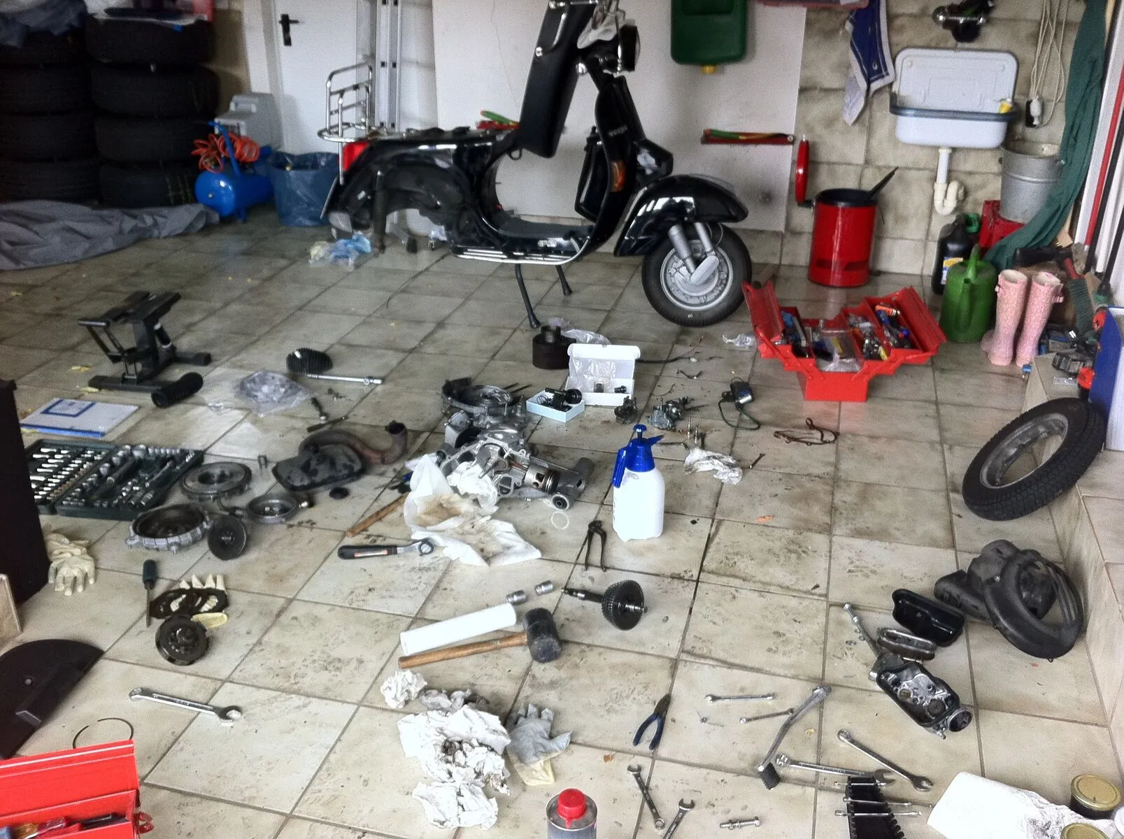 • Motor liegt offen vor mir. Simmerringe mache ich Antriebswelle und den kleinen zur Zündung neu. Die Lager bleiben. Warum sollte man die neu machen? Bei 15.000km sind die doch erst eingefahren!